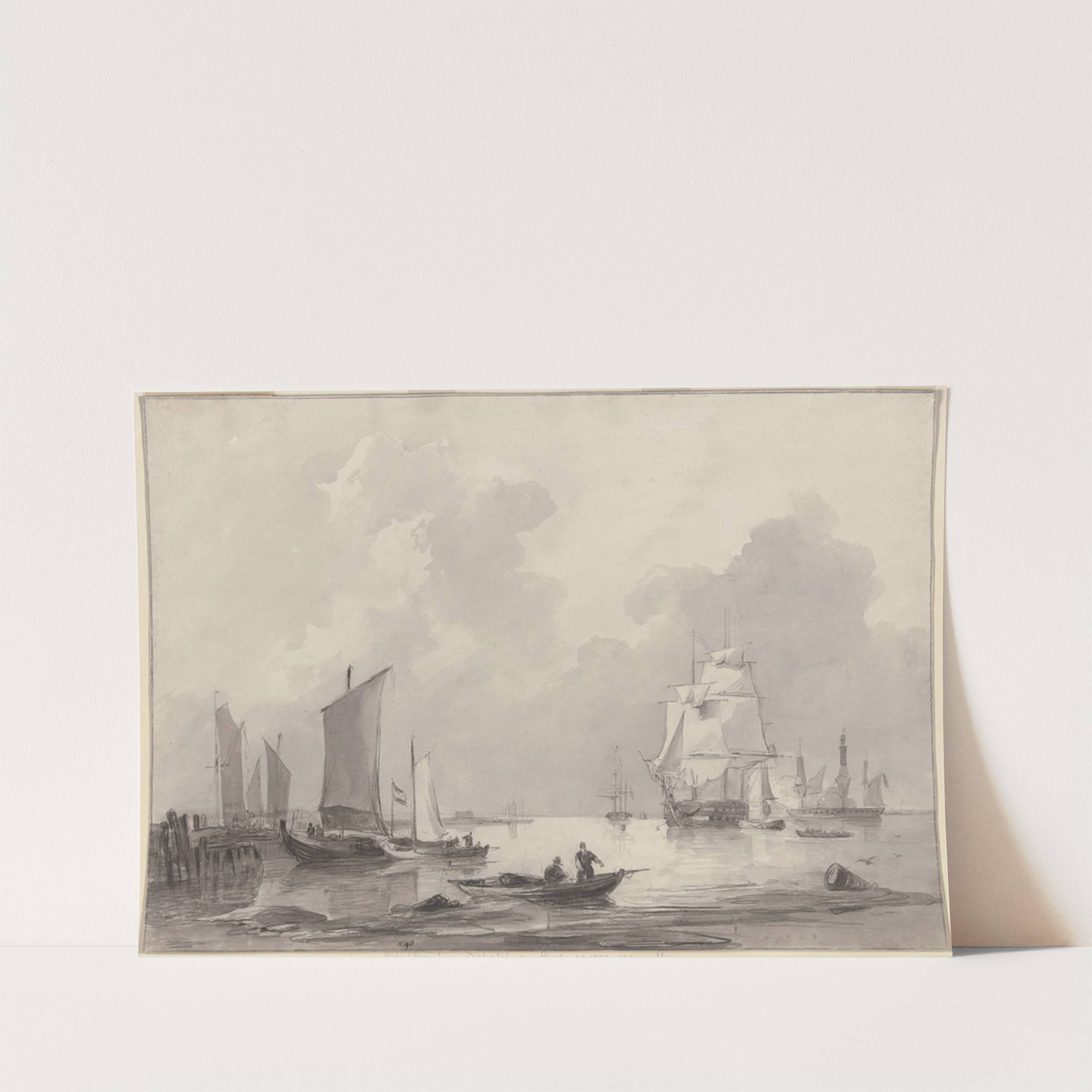 Barken am Strande, rechts größere Schiffe mit Kanonen, vorne rechts eine Barke by Johannes Christiaan Schotel - Wall Art Print