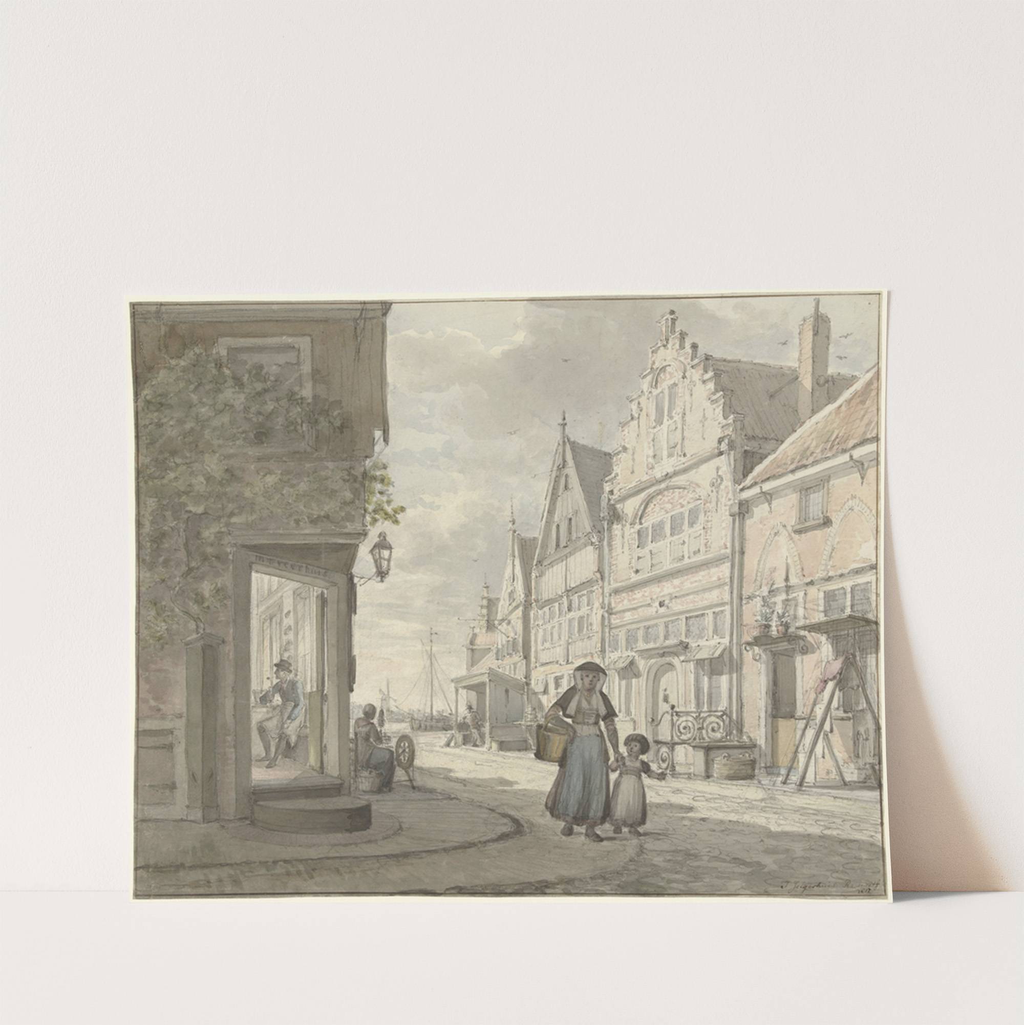 Vrouw en een kind lopen op straat in een vissersdorp by Johannes Jelgerhuis - Wall Art Print