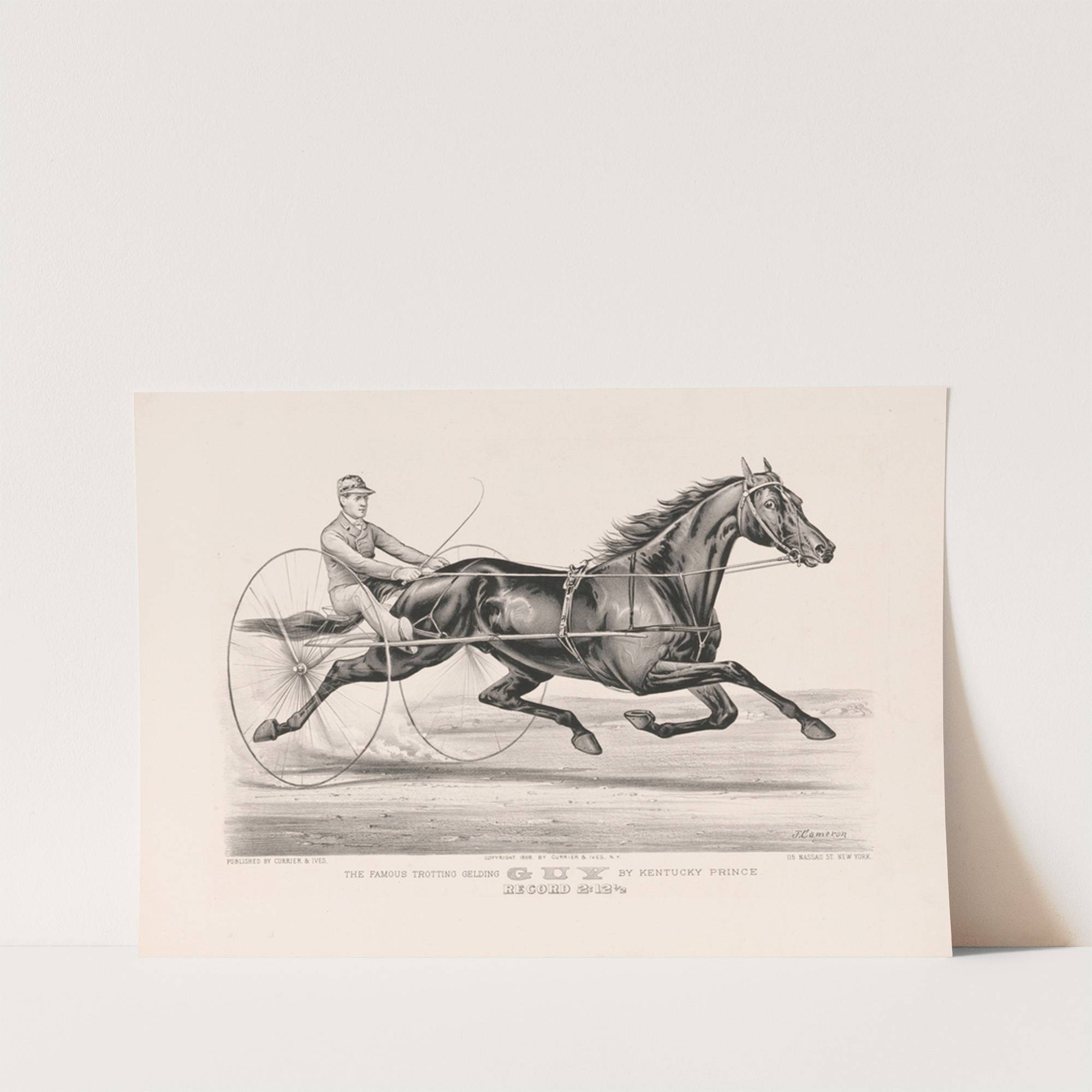 This art print features "The New Jersey trotter" from an illustration by John Cameron titled "Kentucky Prince," created in 1888. The black-and-white drawing showcases a dynamic scene of a male jockey in a racing outfit, expertly guiding a powerful horse...