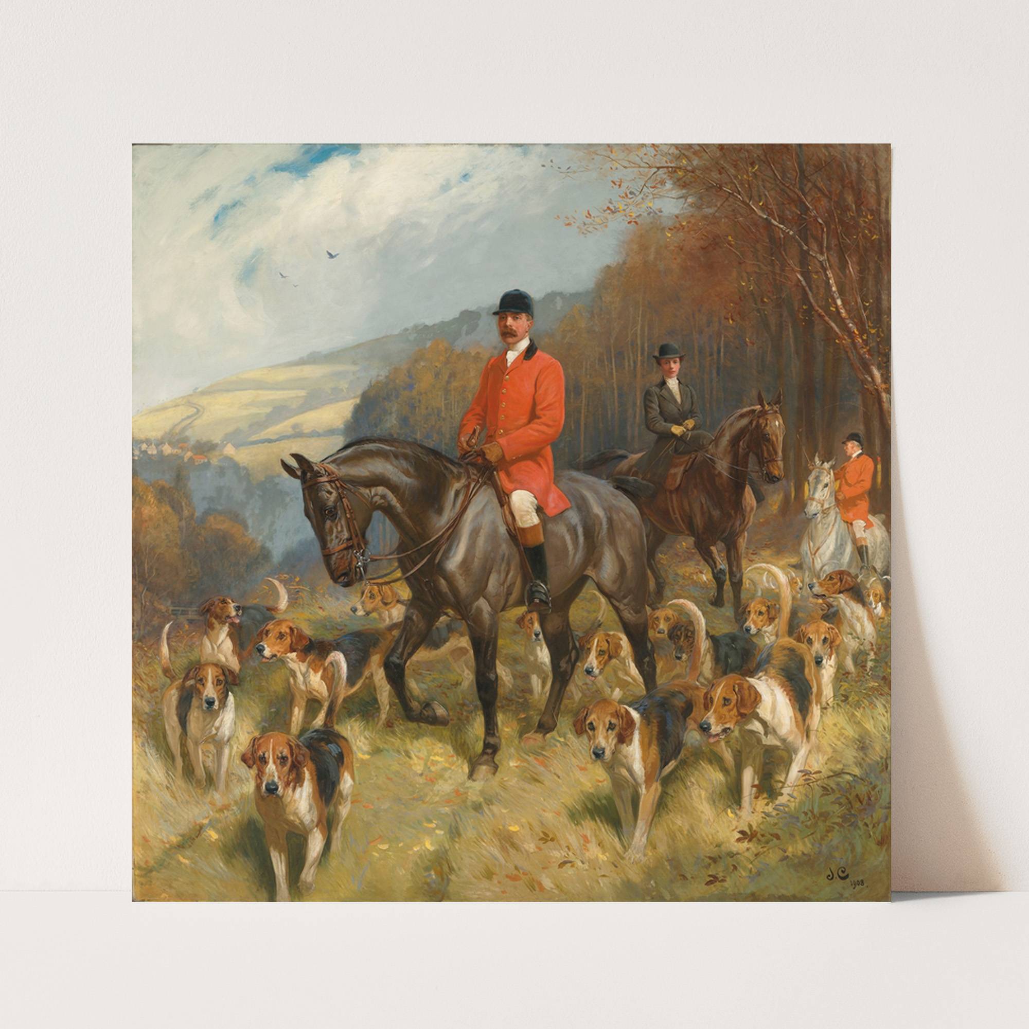 Mr and Mrs Lewis Priestman on hunters with the Braes of Derwent hunt, in a landscape by John Charlton - Wall Art Print