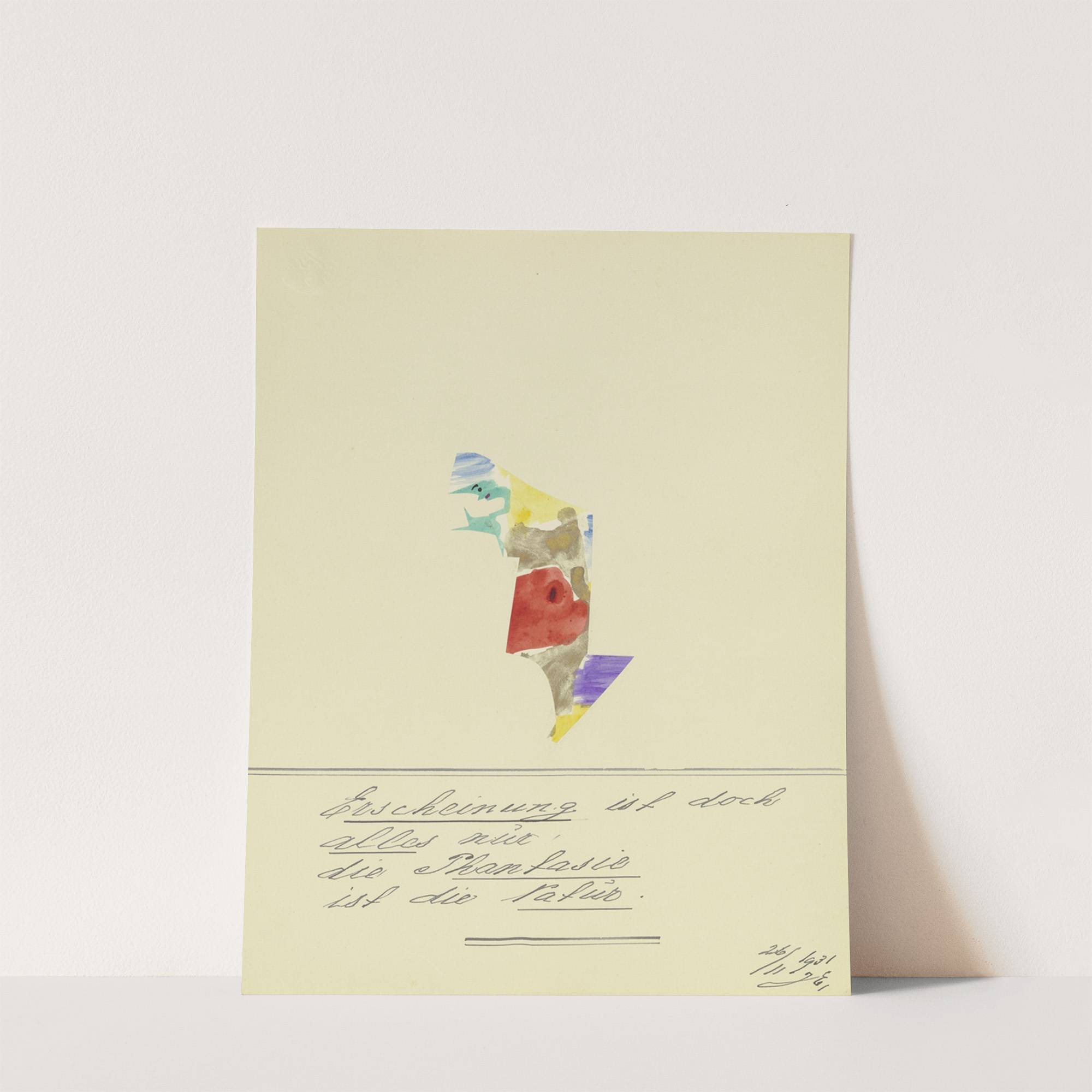 This art print features "Erscheinung ist doch alles nur …" by John Elsas. The composition is abstract yet thought-provoking, centered around a vertical arrangement of fragmented shapes and colors. These include vivid splashes of red, yellow, blue, green, and gray,...