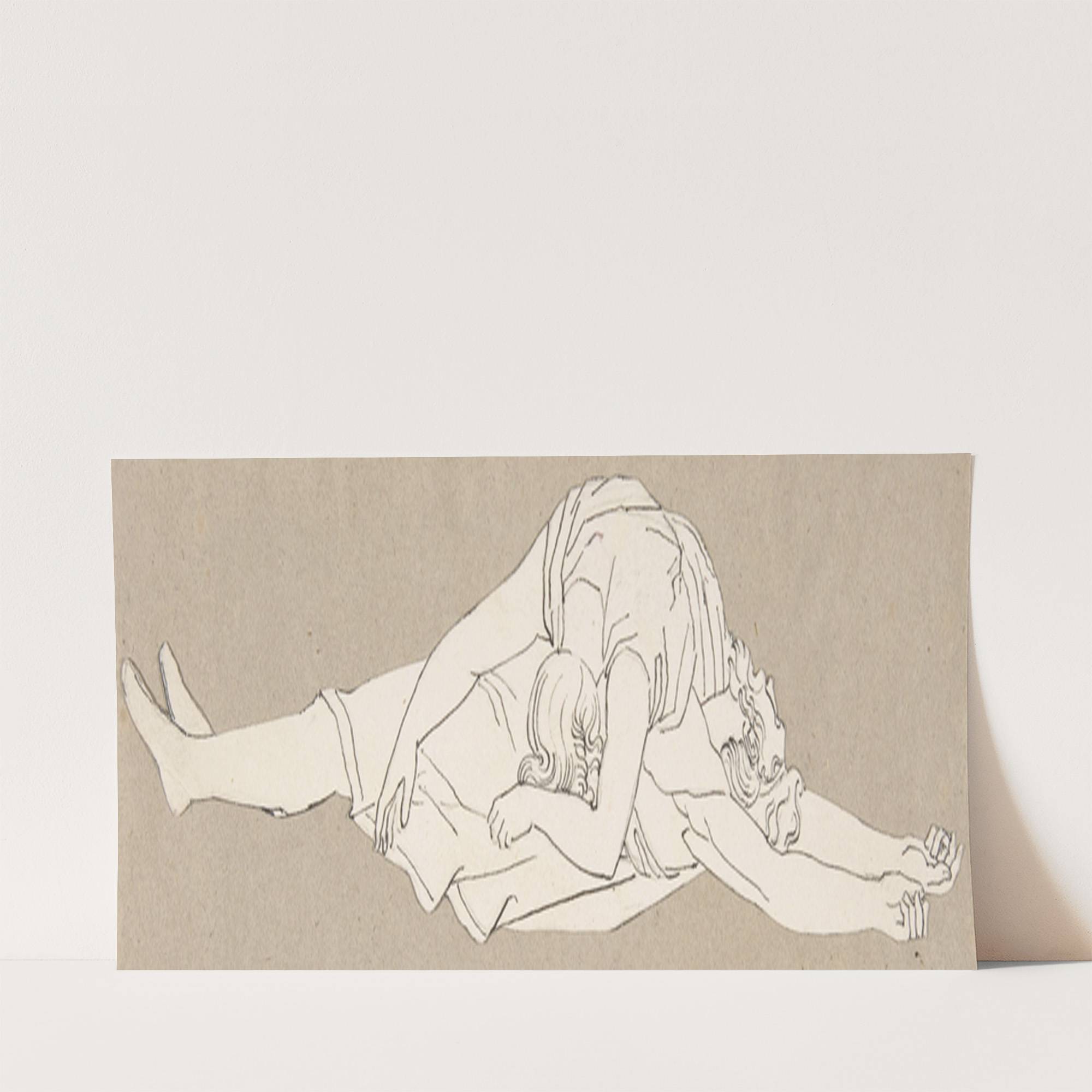 This art print features a minimalist black-and-white illustration by the artist known as After John Flaxman. The composition depicts a young person lying horizontally on their side, with one arm extended outwards and the other bent towards their head. The...