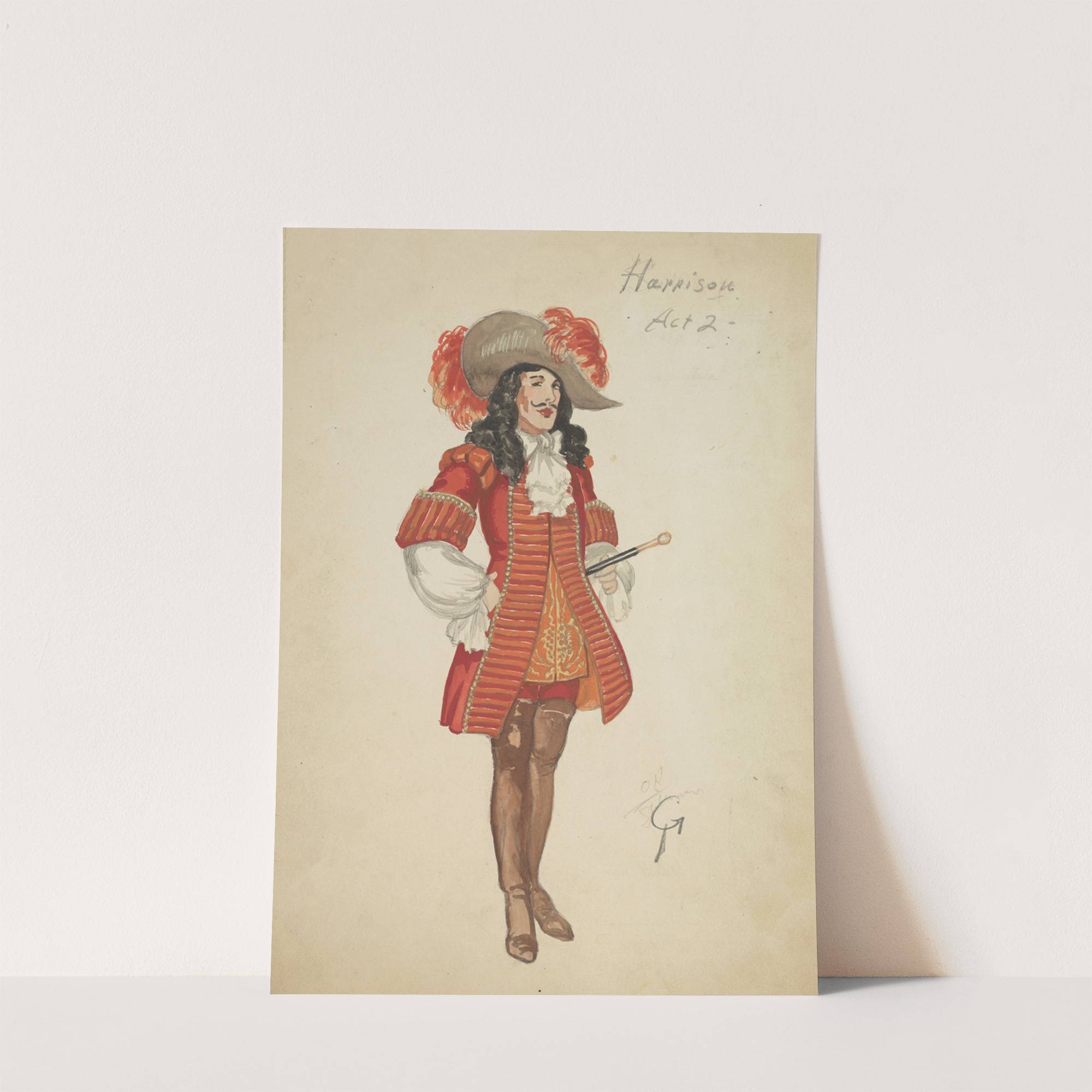 This vibrant illustration features a charming portrait of a gentleman dressed in a 17th-century aristocratic style, titled "Harison (1632)" by artist John Glidden. The subject stands confidently with a slight smile, donning an elaborate red coat adorned with intricate gold...