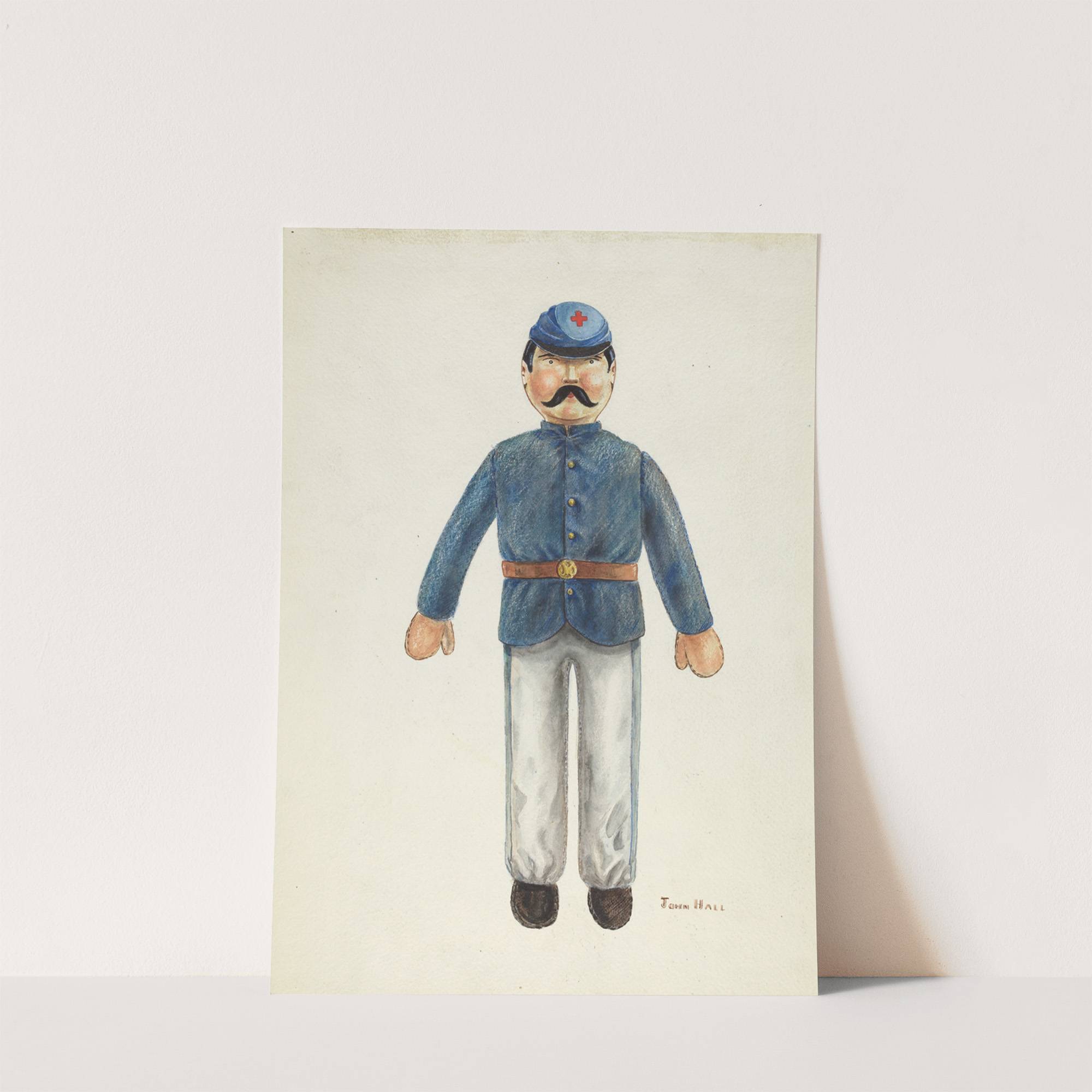 This charming art print features "Doll (c. 1940)" by artist John Hall, capturing the likeness of a traditional military doll with striking detail. The central figure stands prominently in vibrant colors, wearing a classic blue military jacket adorned with gold...