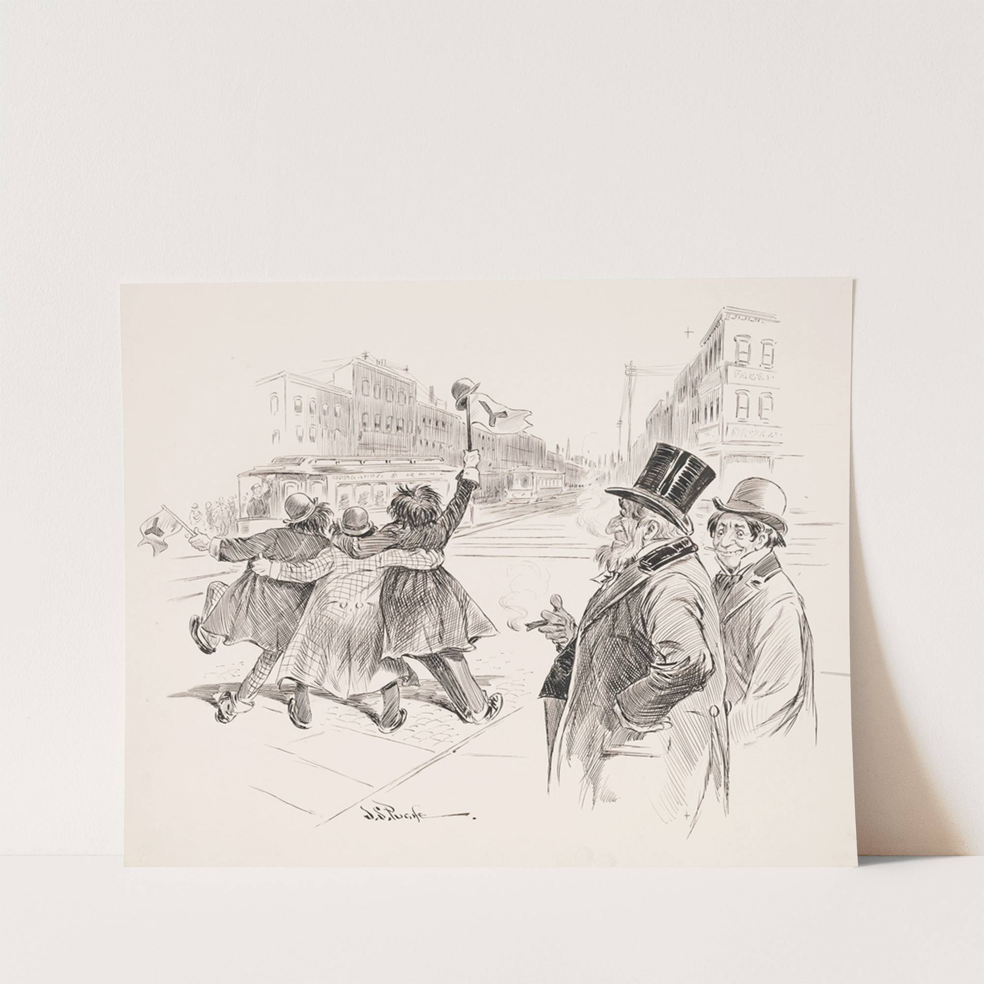 Three drunken Yalies wave down the street as elder man and grinning young man look on. (1897) by John Samuel Pughe - Wall Art Print