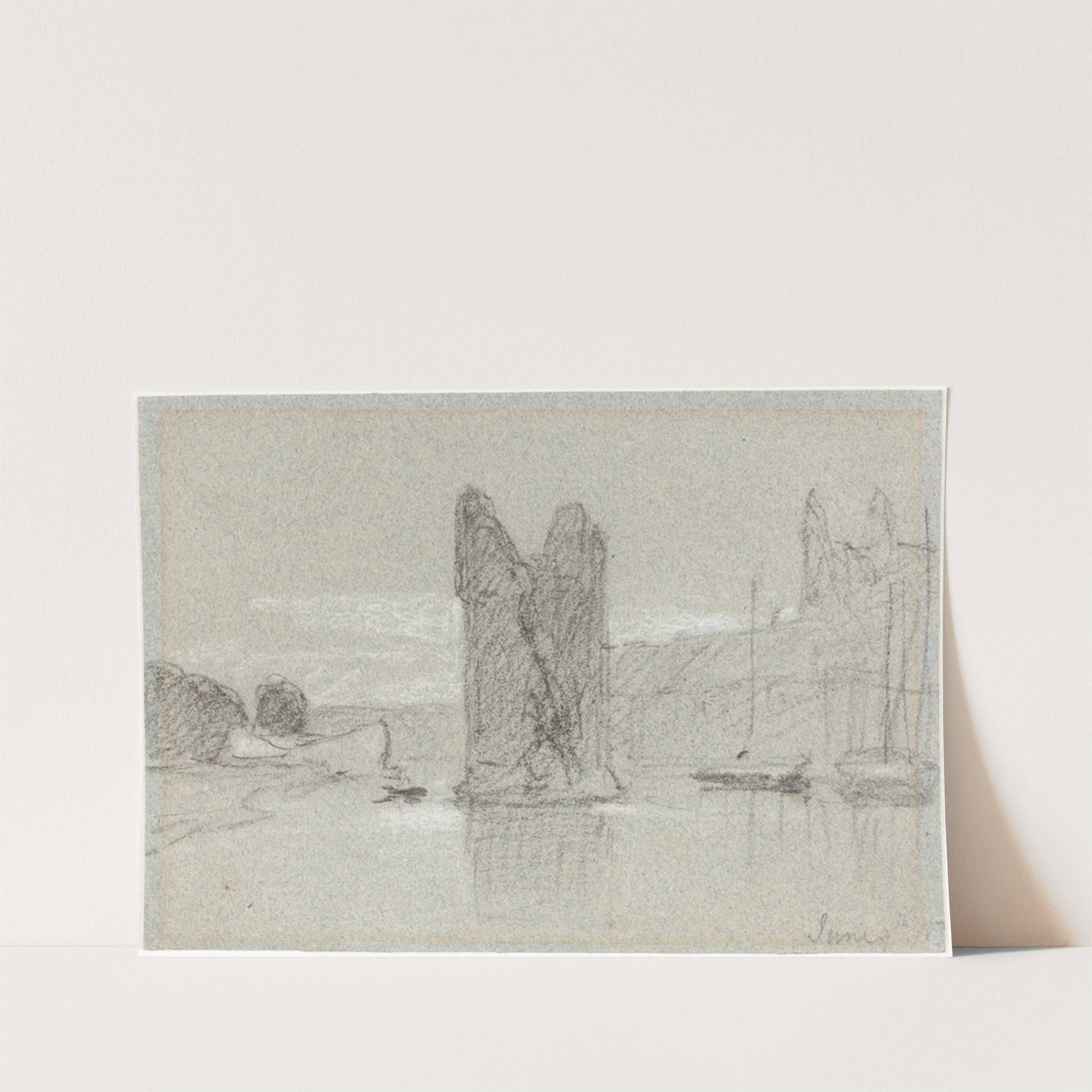 This art print features "The Devil's Tower" by John Sell Cotman, showcasing an elegant, monochromatic pencil sketch of a rugged coastal scene. The centerpiece is two towering rock formations standing prominently in the mid-ground, their rough textures and jagged edges...