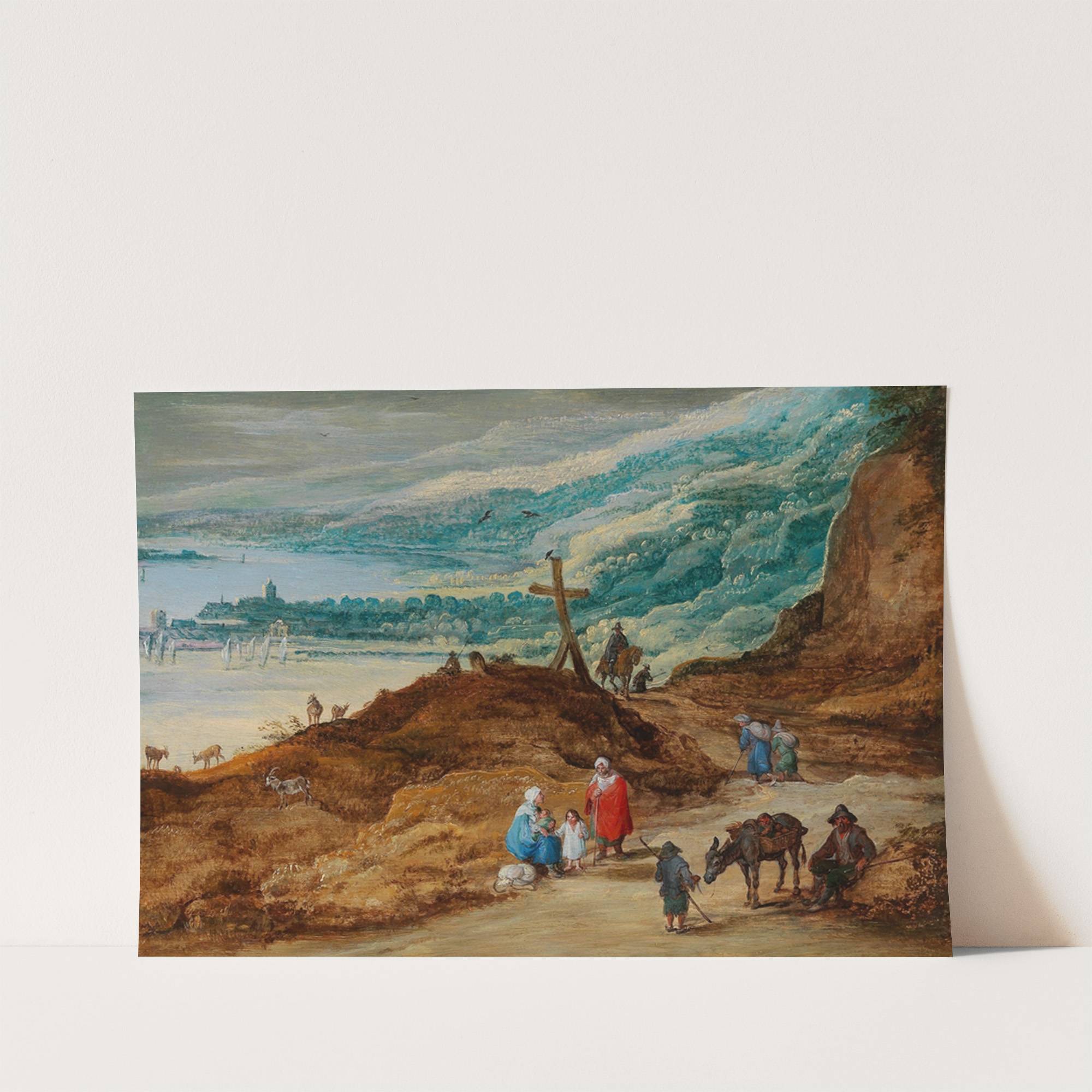 A wide mountainous landscape with travellers by Joos de Momper - Wall Art Print