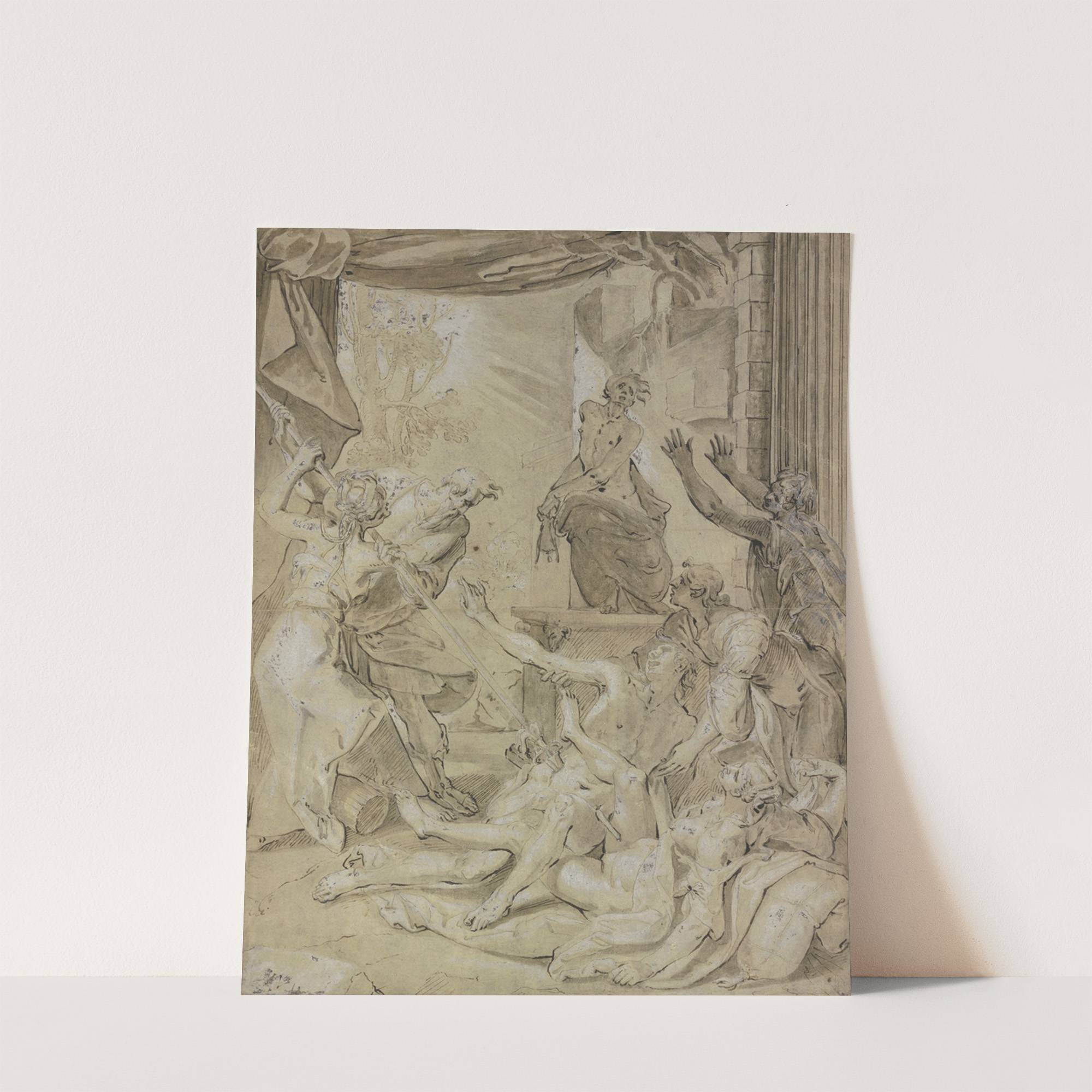 Pinhas durchbohrt Simri und Kosbin auf ihrem Liebeslager mit seinem Speer und beendet die Plage by Joos van Winghe - Wall Art Print