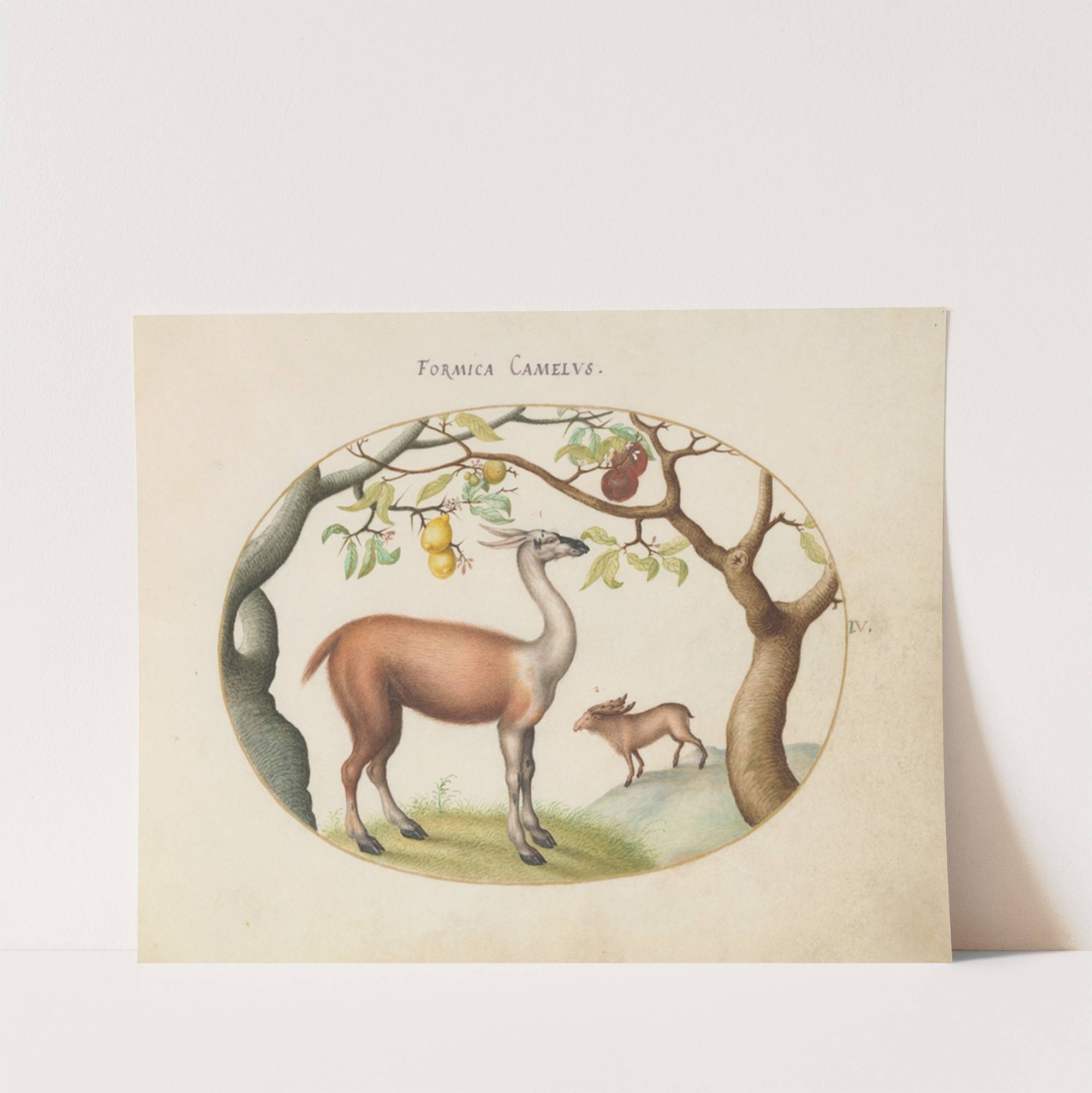 Introducing "Formica Cametes," a beautifully illustrated art print that captures the natural harmony between a deer and its young in a serene woodland setting. This charming piece, created by artist Joris Hoefnagel from the 16th century, features exquisite detail and...