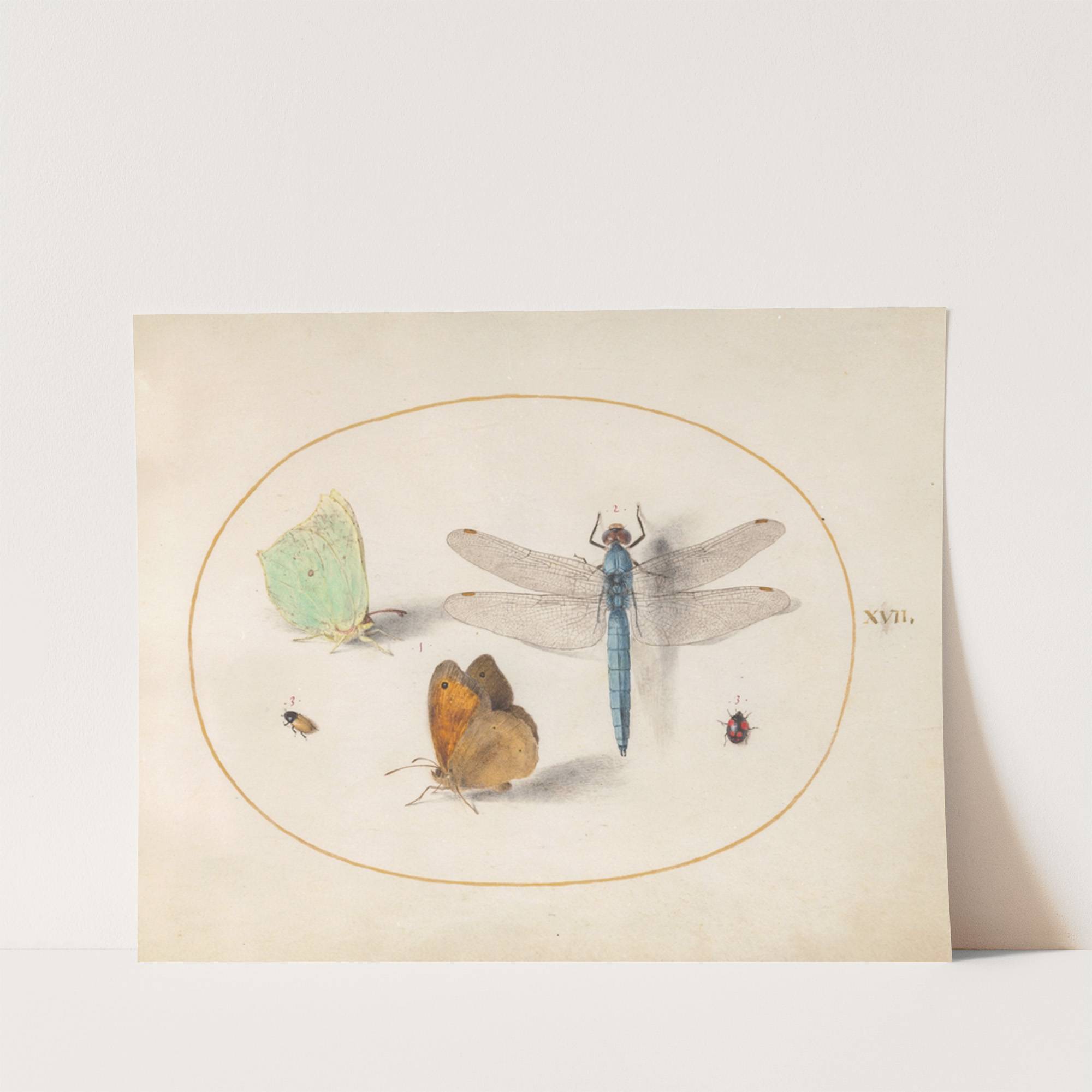 Plate 17; Brimstone and Meadow Brown Butterflies, a Blue Chaser, and Two Small Insects (1575-1590) by Joris Hoefnagel - Wall Art Print