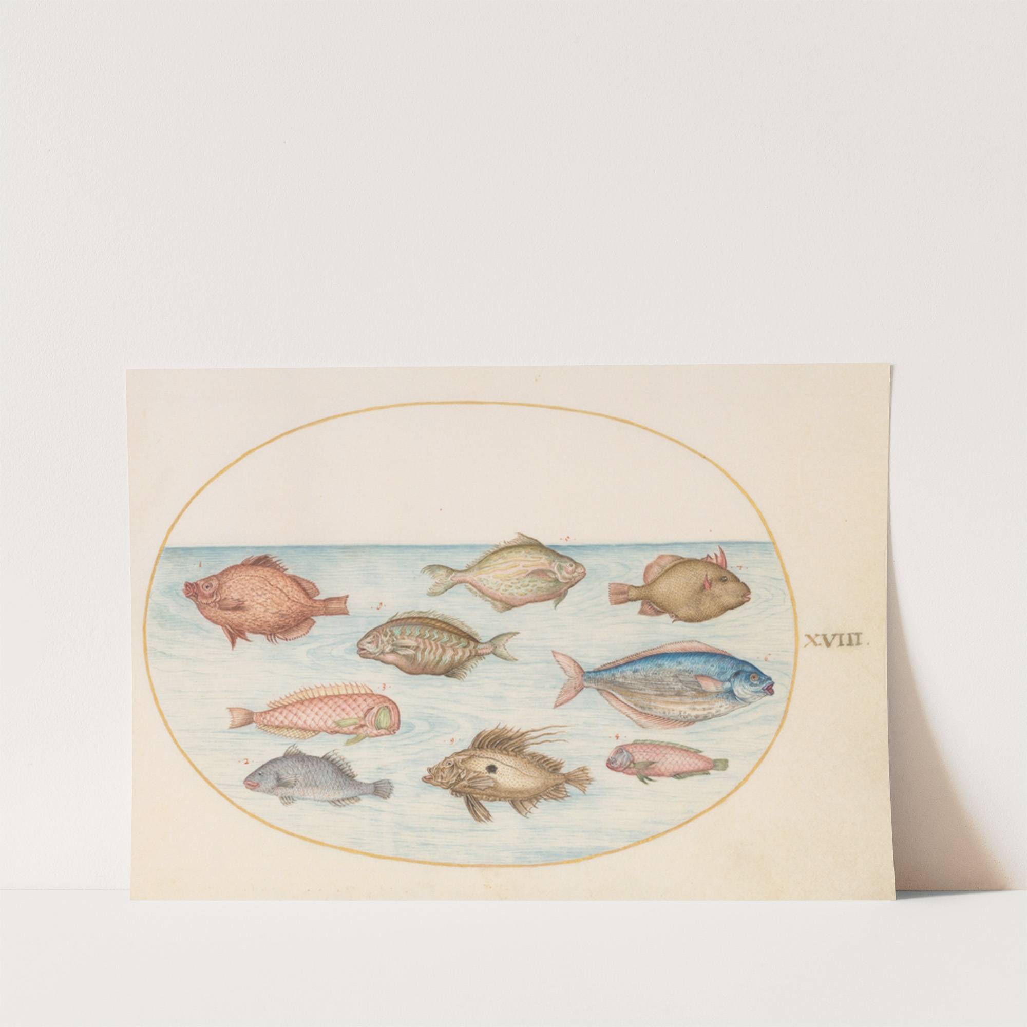 Plate 18; Boarfish, Razorfish, Butterfish, a John Dory, and Other Fish (1575-1590) by Joris Hoefnagel - Wall Art Print