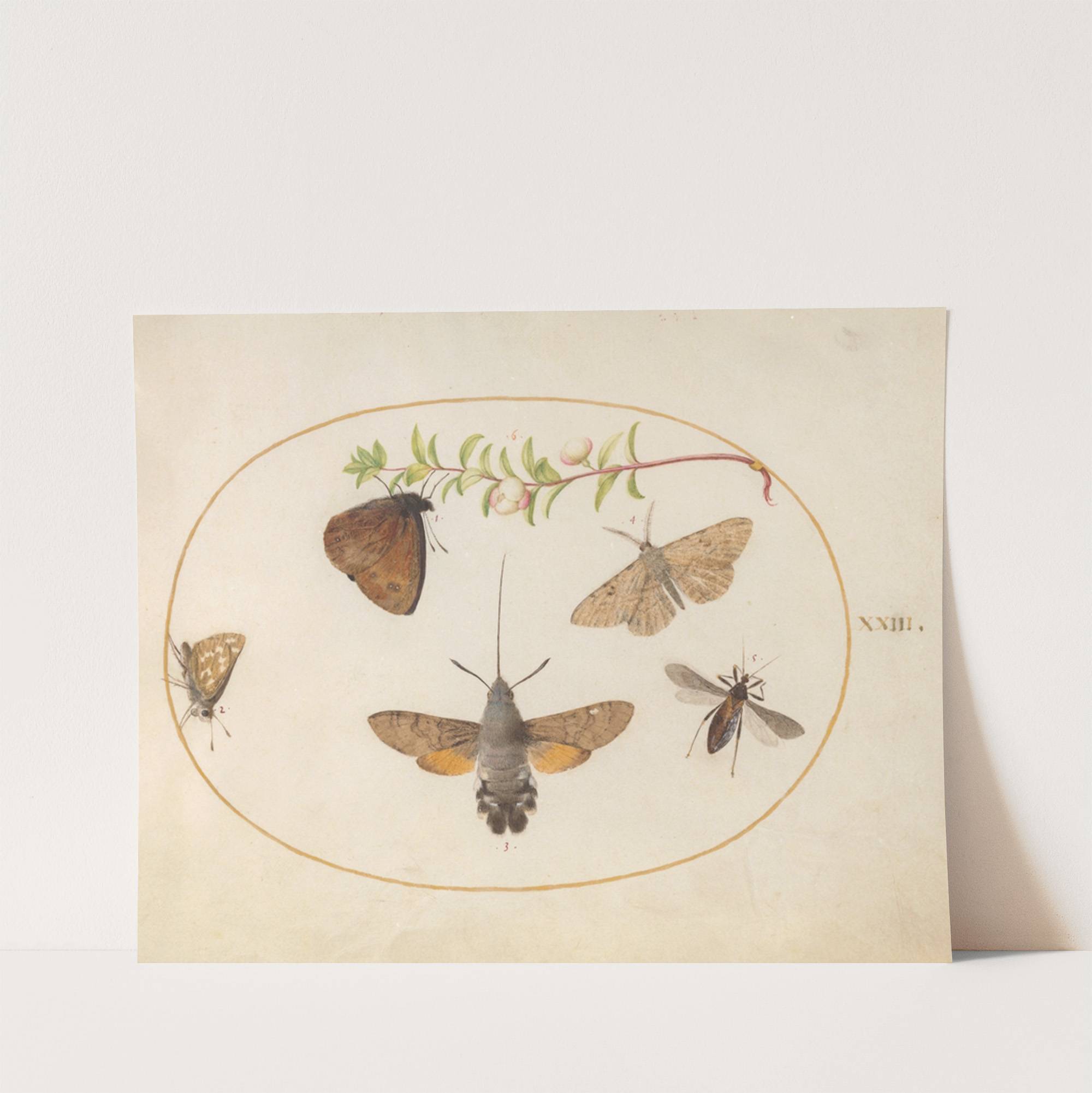 Plate 23; Hummingbird Hawk Moth, Butterflies, and Other Insects around a Snowberry Sprig (1575-1590) by Joris Hoefnagel - Wall Art Print