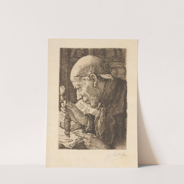 Man seated in front of a bookcase with a quill behind his ear and a mouse in his hand (1888) by Jos Ratinckx - Wall Art Print