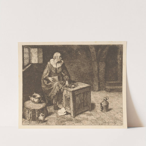 Old man seated on a chest with scales and box by Jos Ratinckx - Wall Art Print