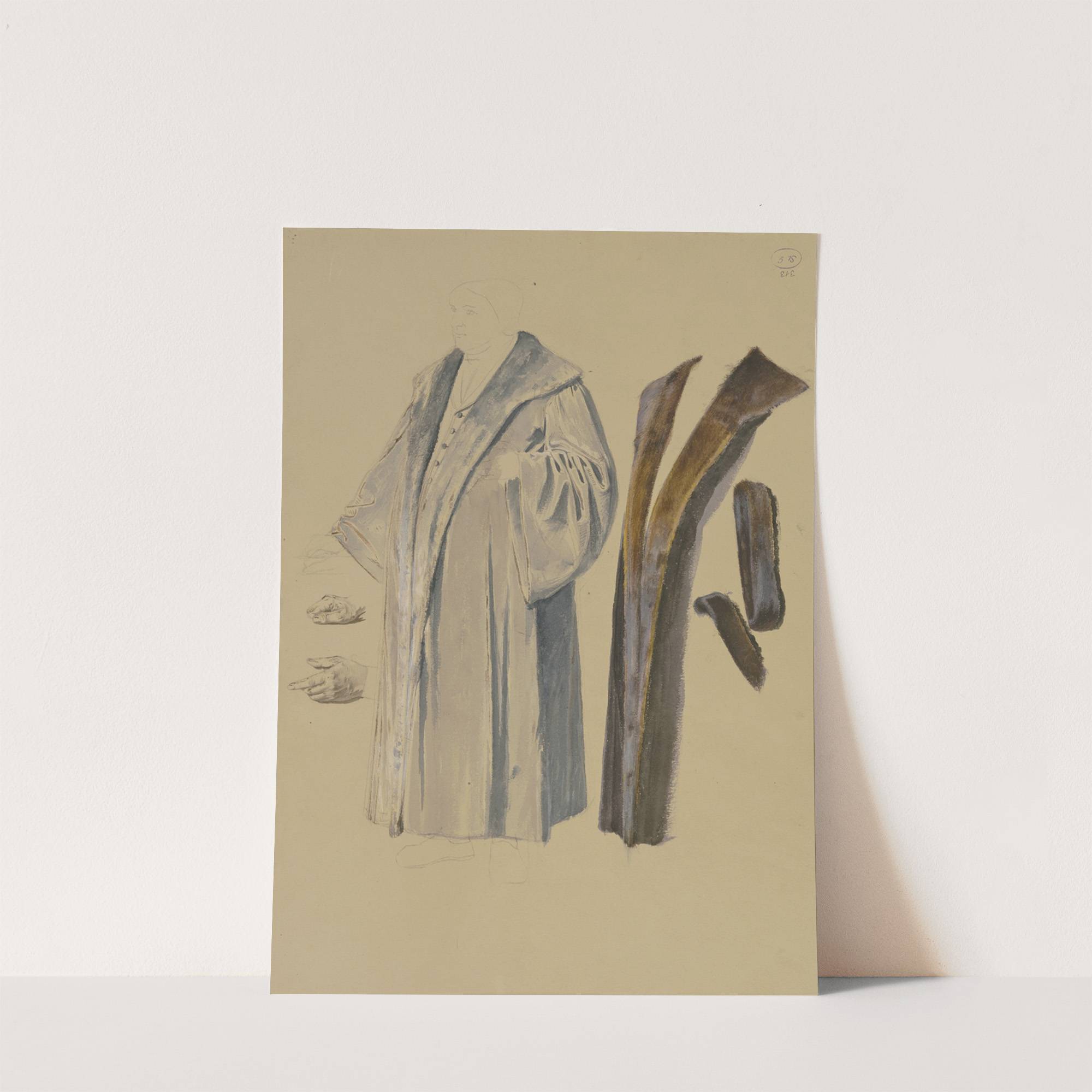 This art print features "Studienblatt: Männliche Kostümfigur sowie Handstudien" by Josef Ferdinand Becker, rendered in a subtle yet striking watercolor style. The composition showcases a figure dressed in an elegantly draped cloak, with delicate brushstrokes capturing the folds and texture...