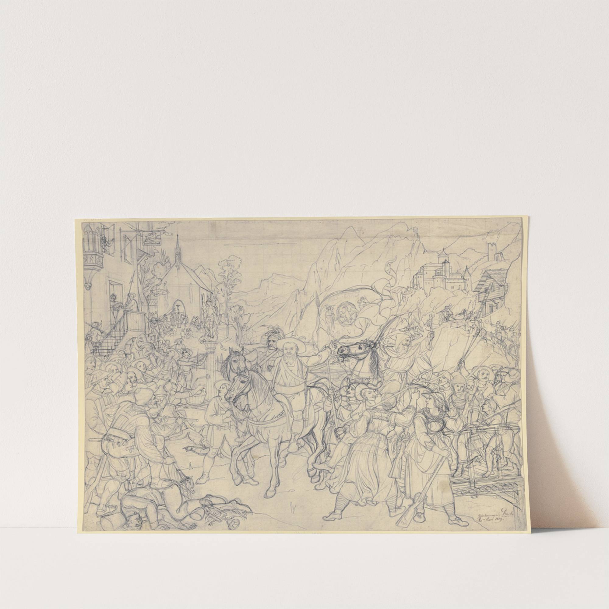 This art print captures the dynamic scene of "Der Tiroler Landsturm im Jahre 1809" by Joseph Anton Koch. Executed in meticulous monochromatic pencil, the artwork portrays a bustling historical battle, teeming with detailed figures and action. On the left side,...