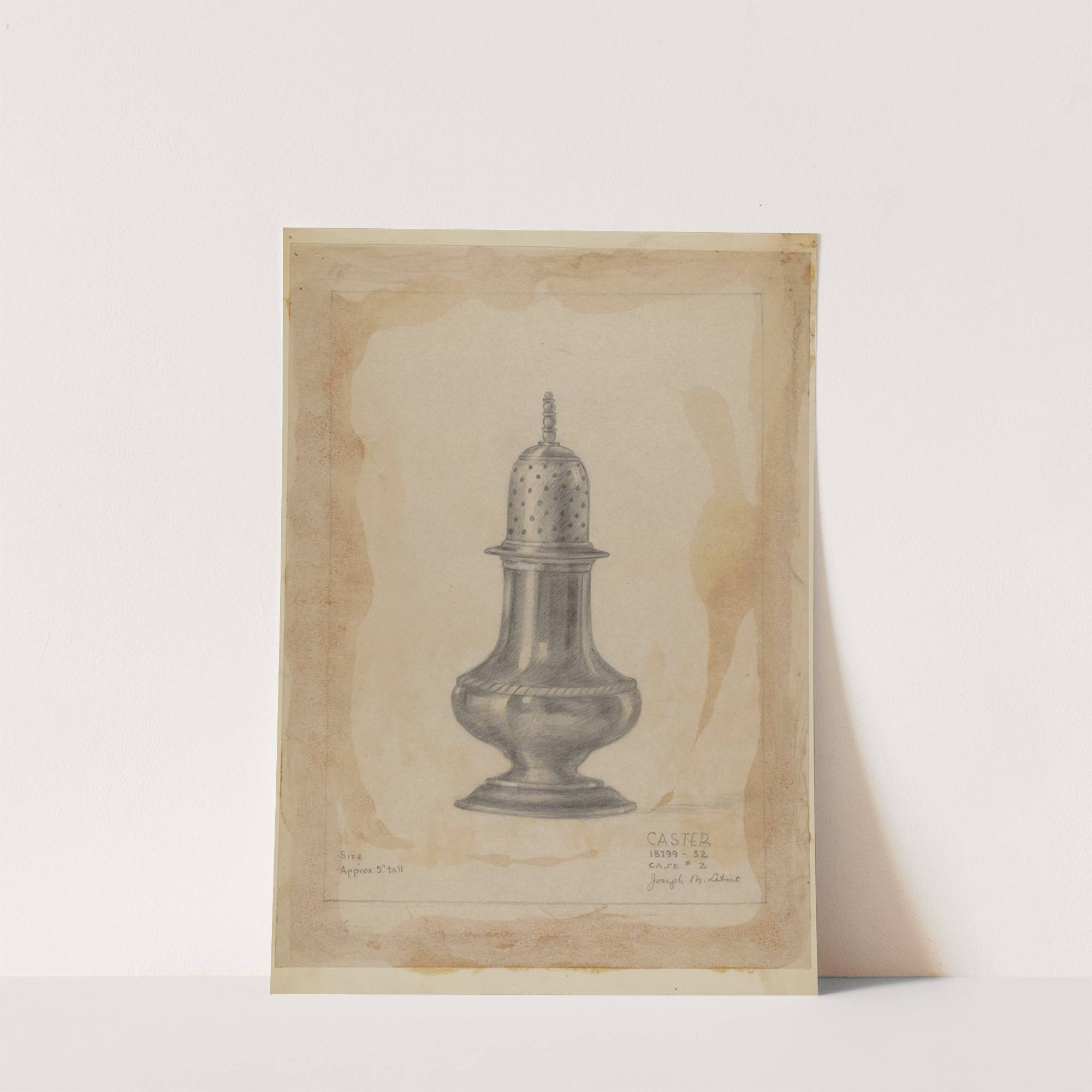 This art print features "Castell" by Joseph Leobt, a meticulous pencil drawing of an ornate metal object with a vintage aesthetic. The subject is a traditional cast iron casserole dish, characterized by its elegant, bulbous form and elaborate lid, which...