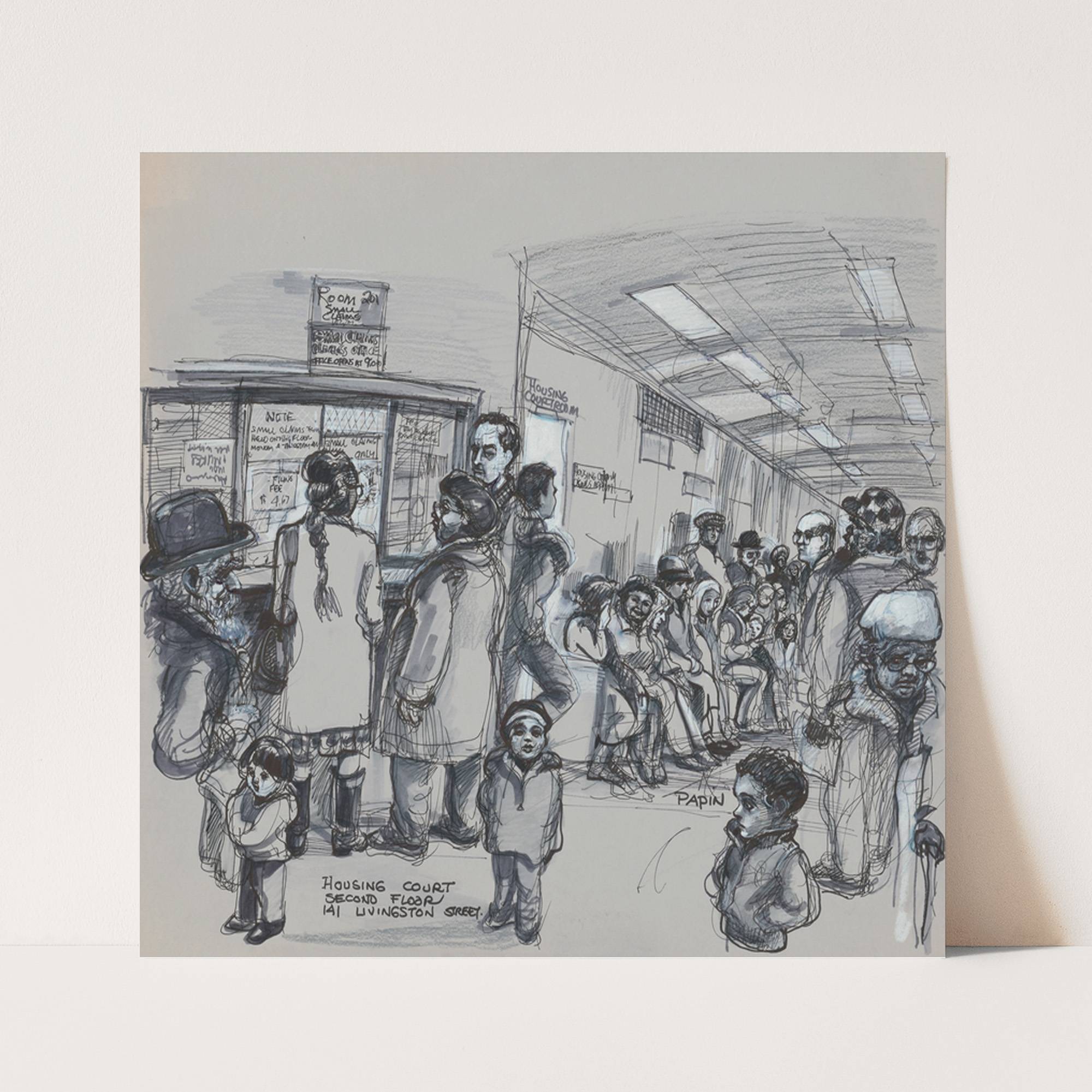 Interior view of a corridor at the Kings County Housing Court with many people of all ages waiting outside the “Housing Courtroom” by Joseph Papin - Wall Art Print