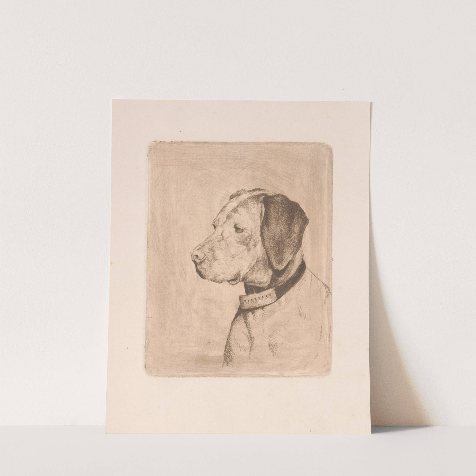 This exquisite artwork captures the serene profile of a dog in a finely detailed, monochromatic pencil drawing. The subject is an animal portrait featuring a medium-sized breed with floppy ears, gently shaded to highlight its soft fur texture and subtle...