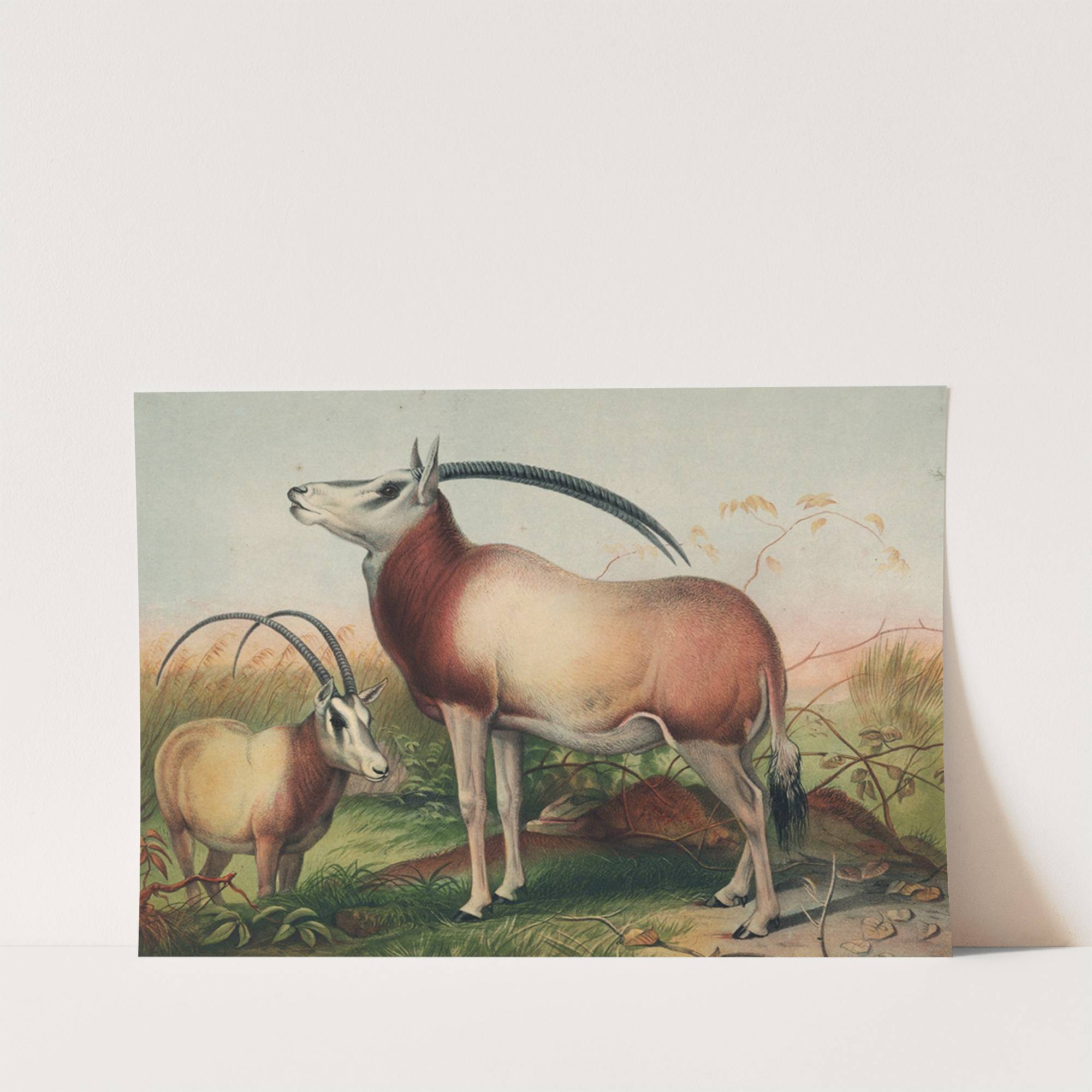 This stunning art print captures "The Leucoryx Antelope" by the renowned artist Joseph Wolf in exquisite detail. Depicted with rich, lifelike colors, this piece showcases two antelopes in their natural habitat. The larger antelope stands tall and proud on the...