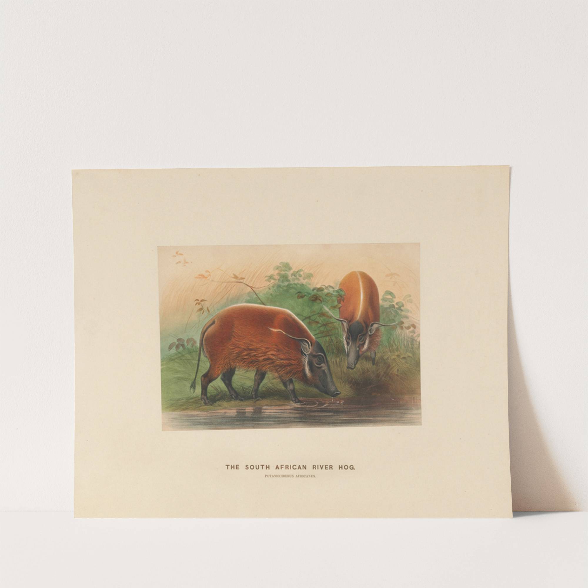 Discover the captivating beauty of nature with "The South African River Hog" art print by Joseph Wolf. This stunning piece depicts two river hogs standing by a tranquil waterway, set against a softly lit backdrop of greenery and tall grasses....