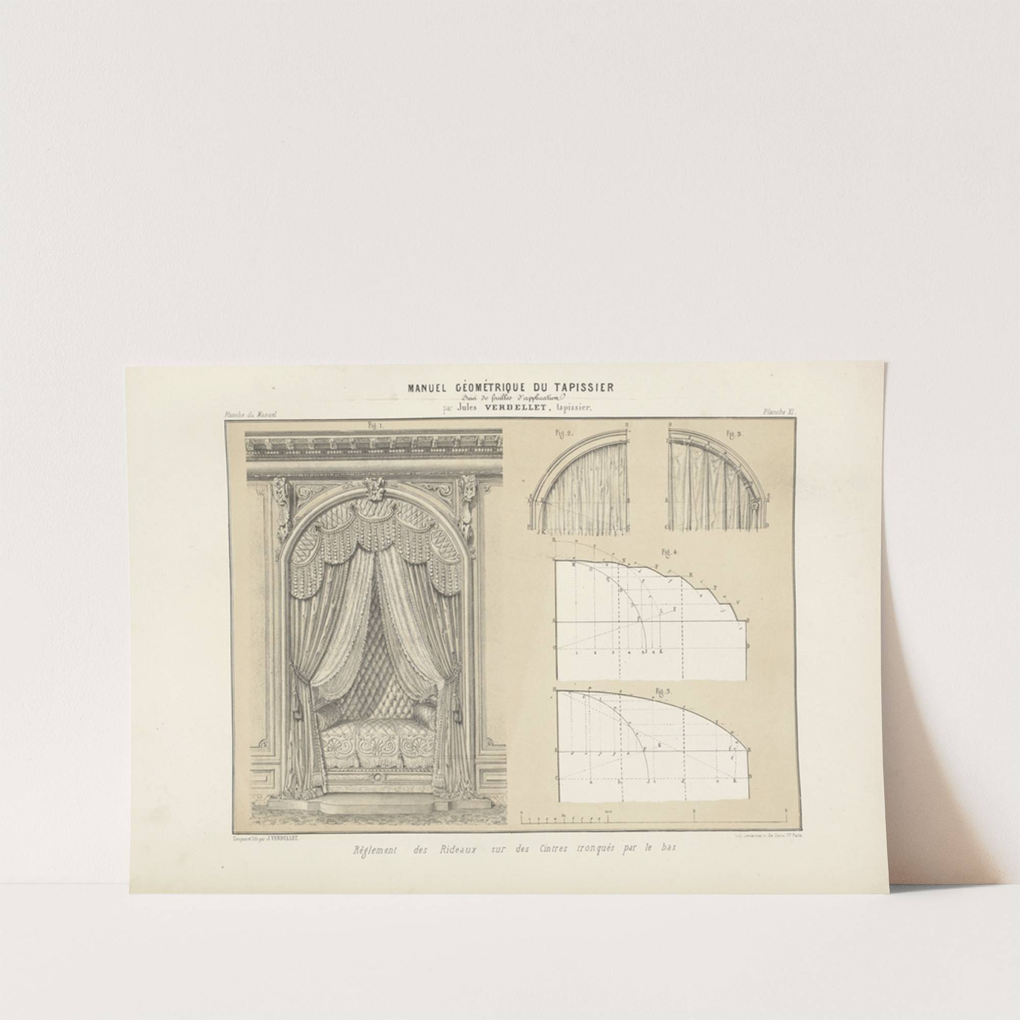 This elegant architectural illustration, "Manuel d'Ornithographe en Volume," is an intricate black-and-white drawing that showcases exquisite classical design elements. The left section features a detailed depiction of a luxurious canopy bed with heavy, draped curtains tied back to reveal an...