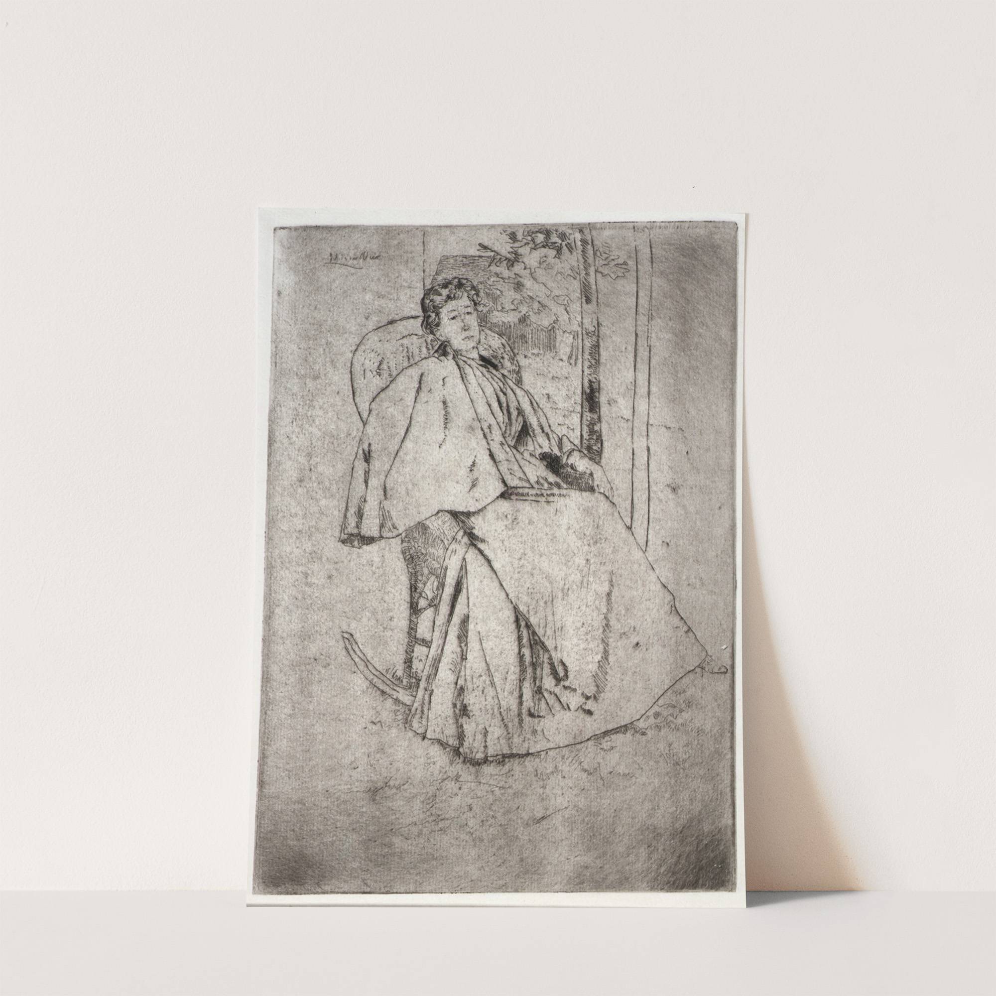 This black-and-white artwork titled "The Rocking Chair" by Julian Alden Weir features a serene figure seated in an elegant rocking chair. The subject is a young person with soft, curly hair, dressed in flowing garments that suggest a sense of...