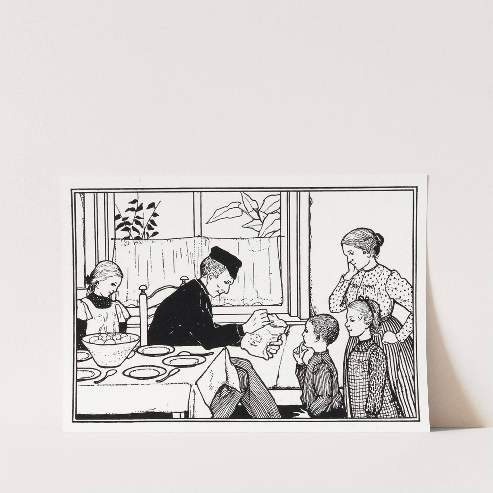 This black-and-white illustration captures a charming domestic scene reminiscent of early 20th-century art styles. The image depicts a family meal setting where a father in traditional attire, including a distinctive hat, sits at the table engaging with his young children....