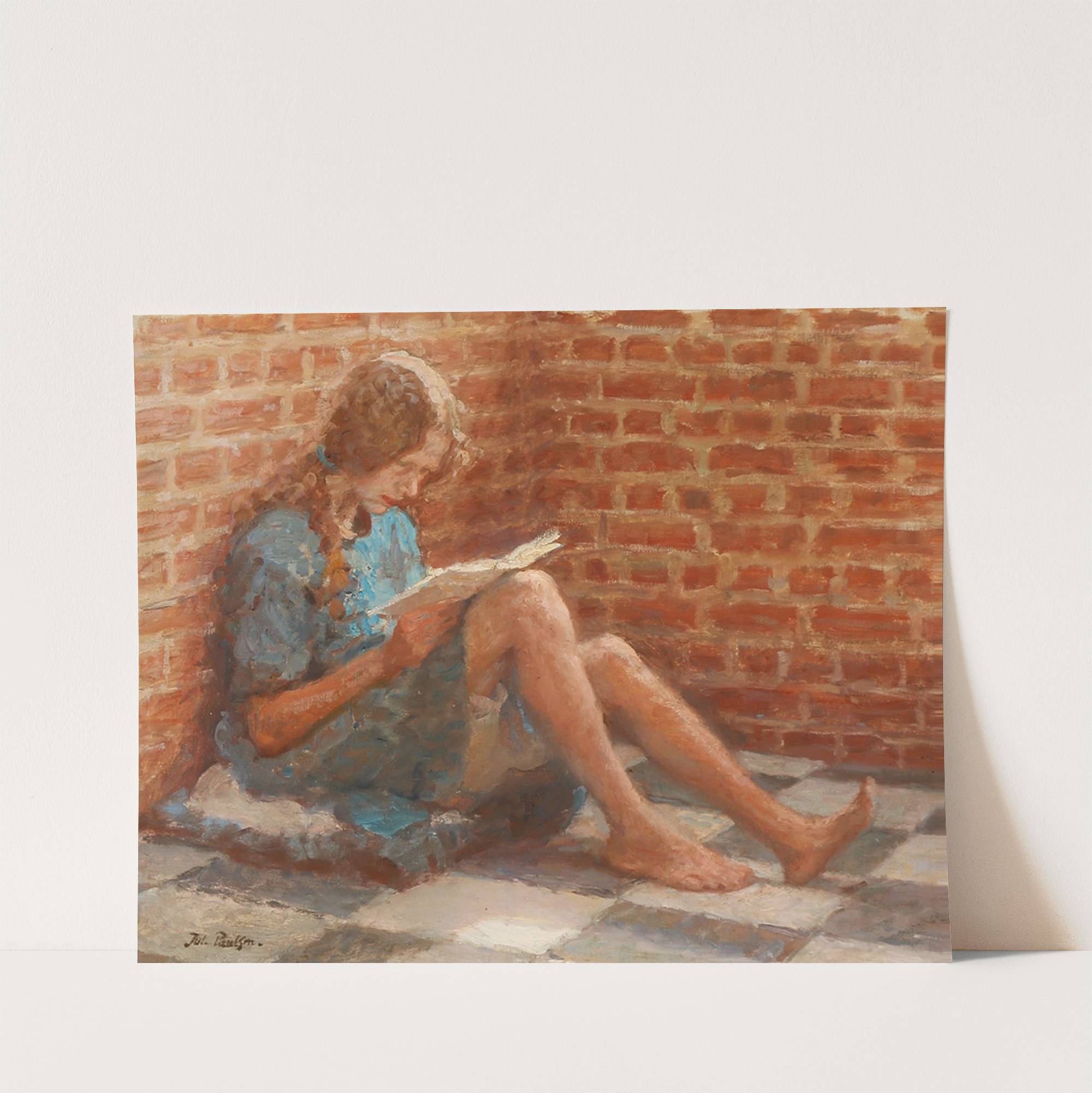 Læsende pige siddende ved en murstensvæg by Julius Paulsen - Wall Art Print