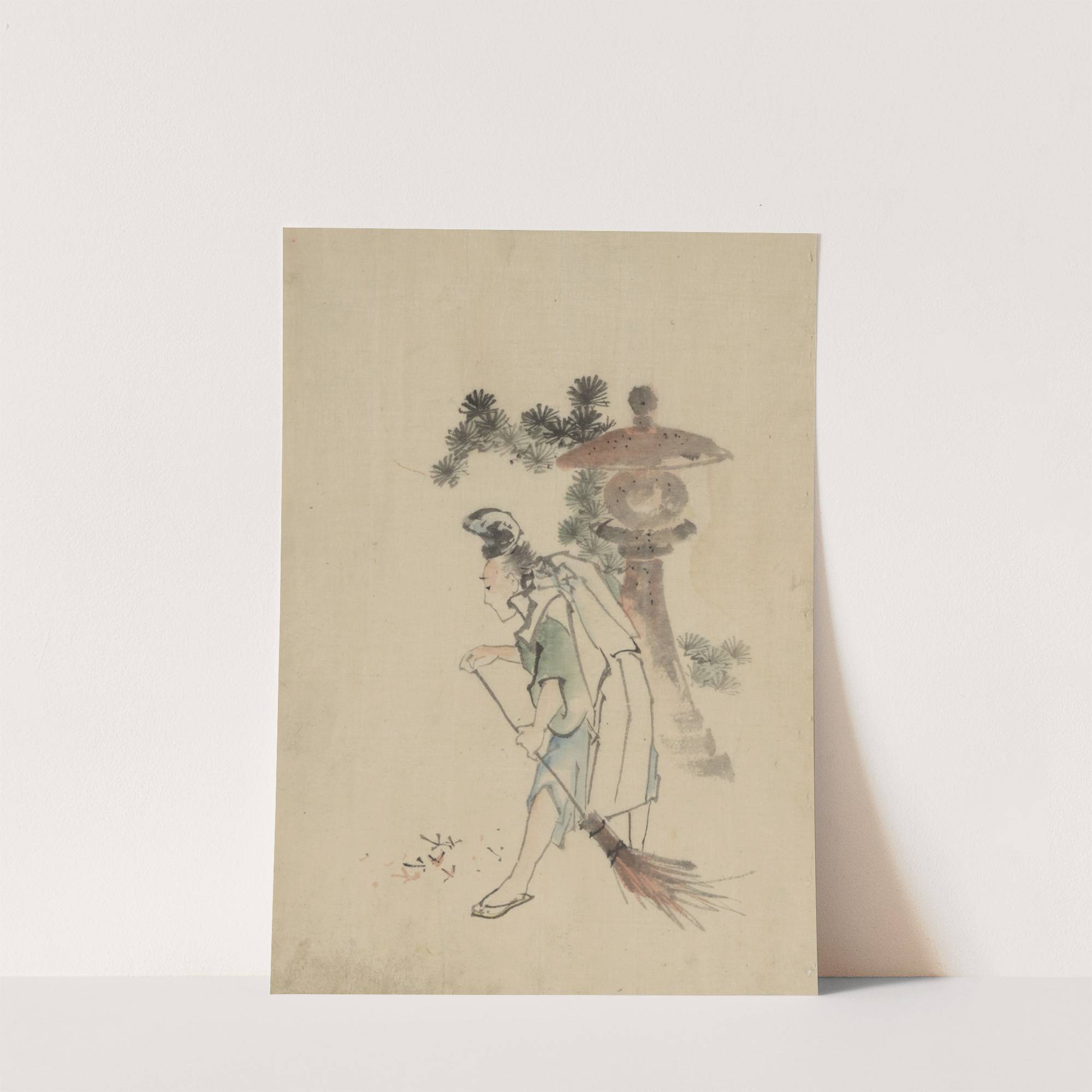 A man sweeping pine needles that have fallen from a tree near a stone shrine by Katsushika Hokusai - Wall Art Print