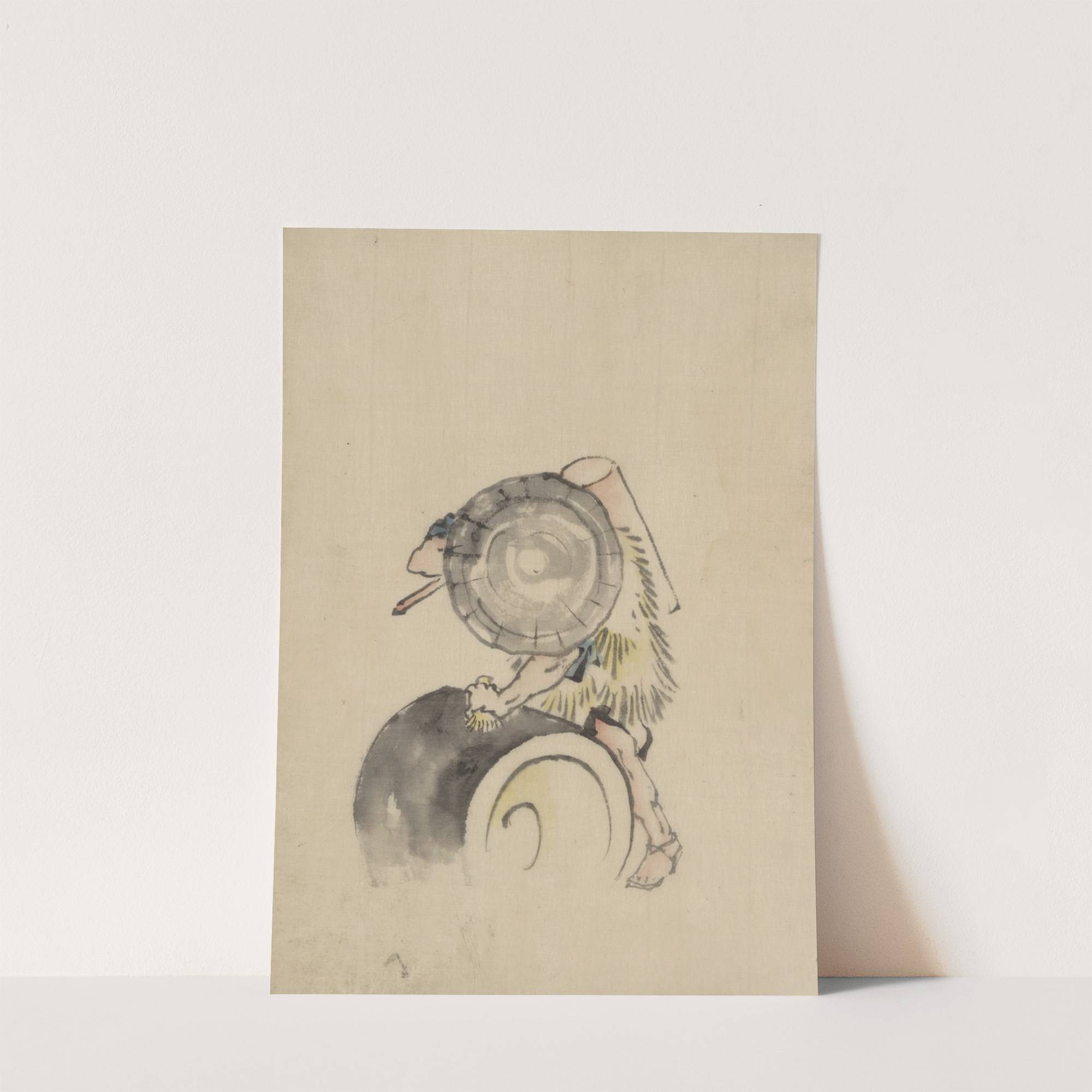 A man, wearing a large conical hat and a straw or feather garment by Katsushika Hokusai - Wall Art Print