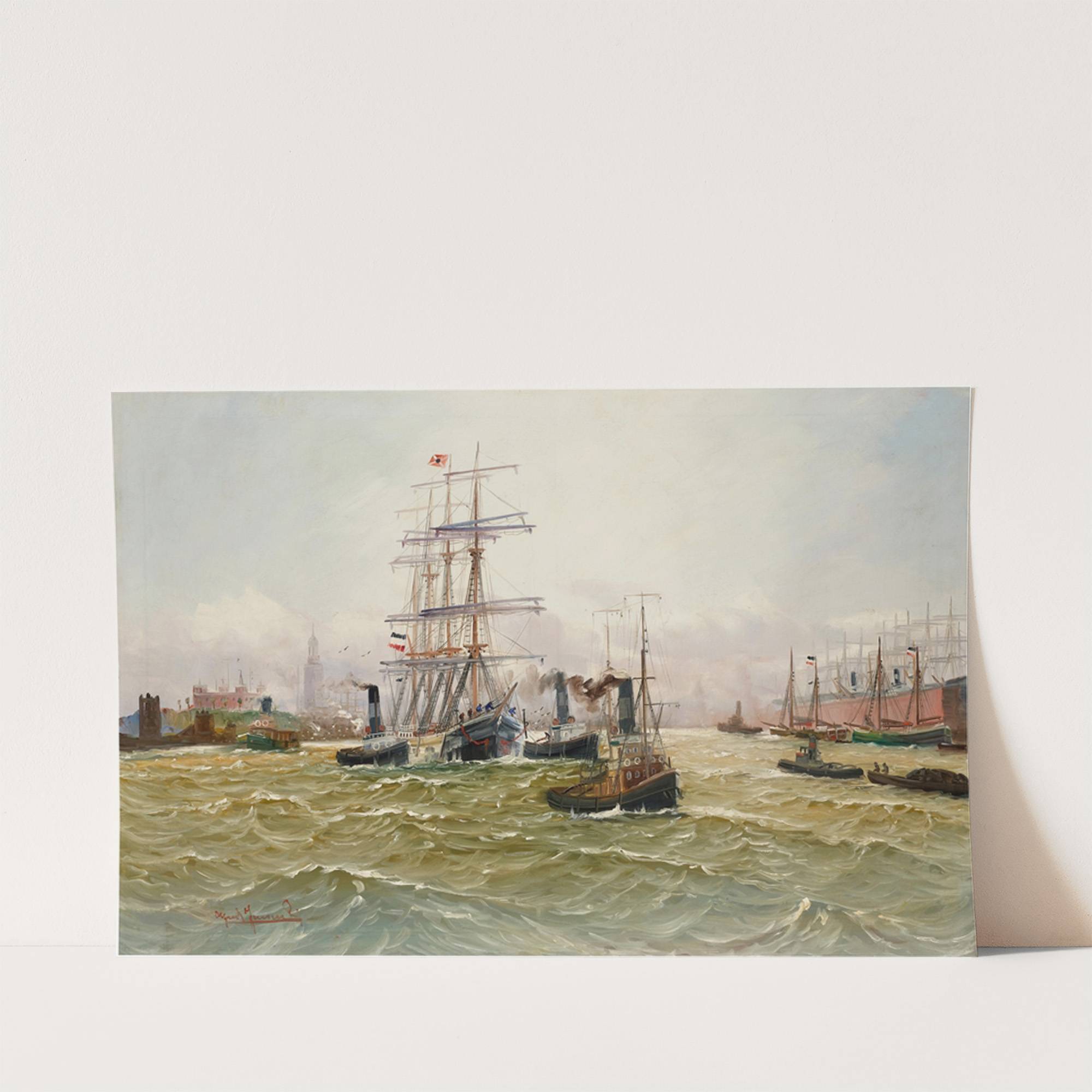 This captivating art print features "A Three-Master and Sail Boats with the French Flag in the Hamburg Harbour" by Alfred Jensen. The scene is set against a foggy, overcast sky that gently diffuses the sunlight, creating a serene yet dynamic...
