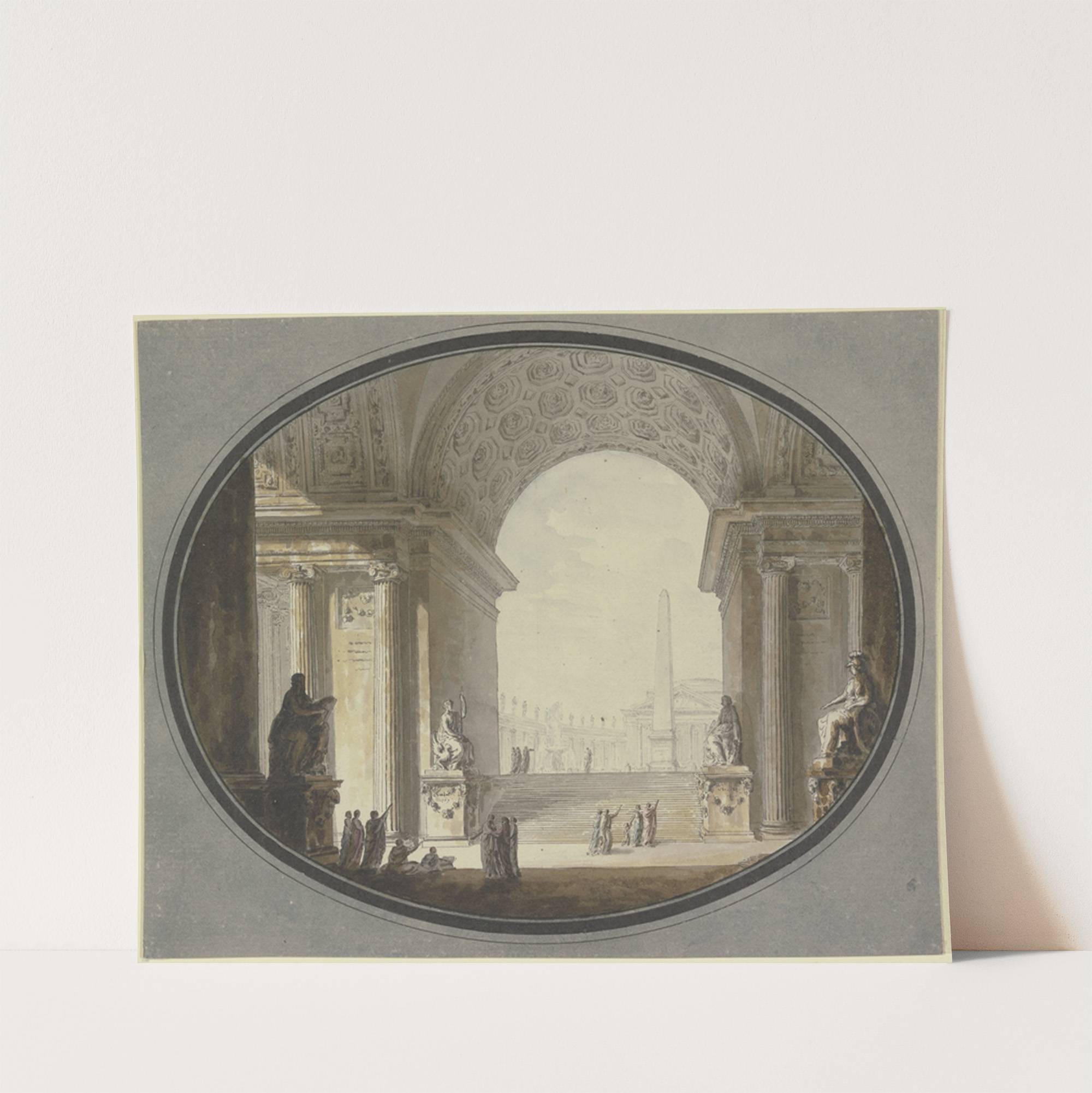 Blick durch ein kassettiertes Rundbogengewölbe auf einen dem Petersplatz in Rom nachempfundenen Platz, im Scheitel ein dem römischen Pantheon ähnelnder Bau by Jacques-François Blondel - Wall Art Print