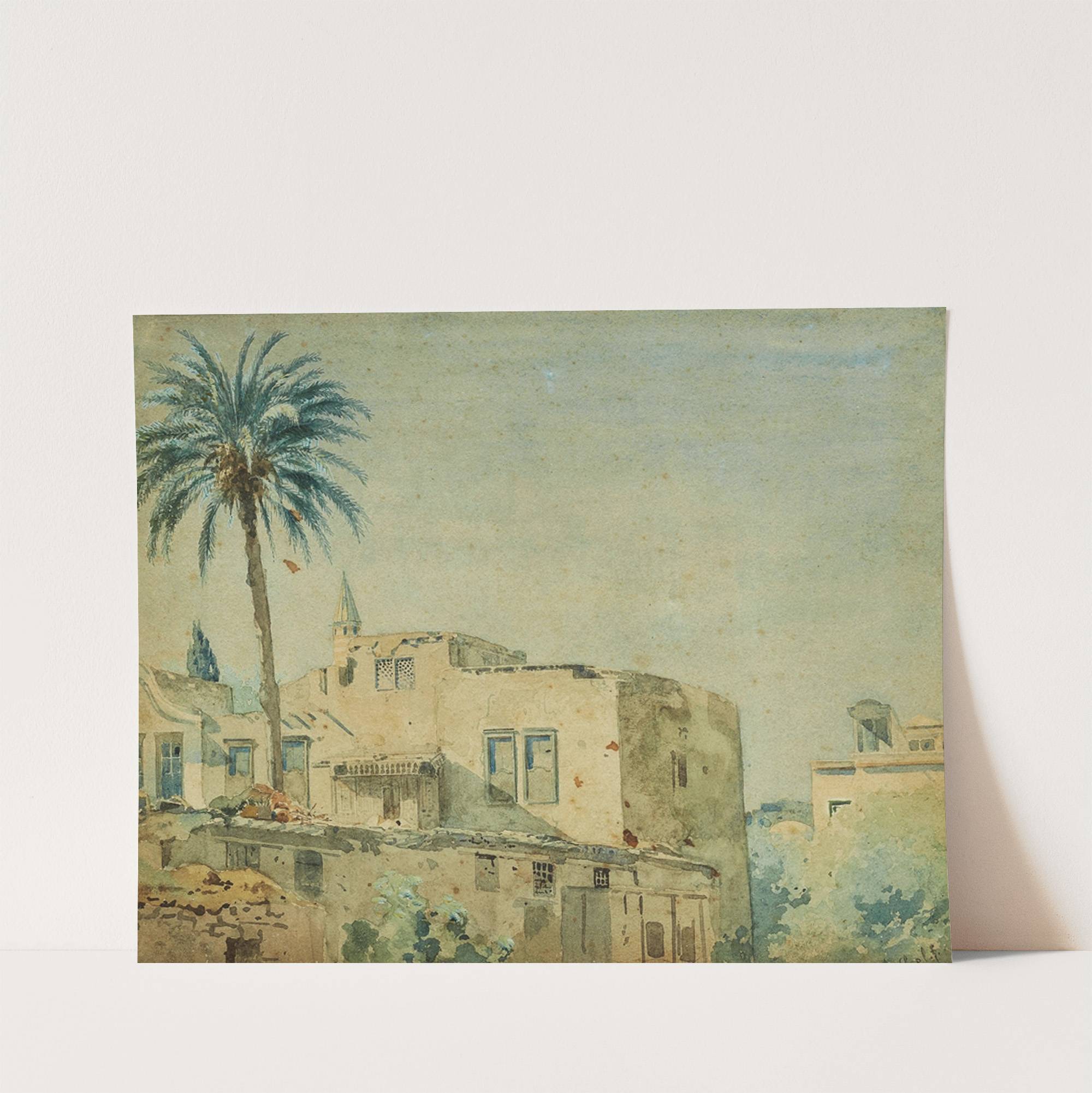 This art print features "Ein Winkel in einer orientalischen Stadt" by Adolf Seel, rendered in a delicate watercolor style. The scene depicts a tranquil, sunlit street in an Oriental cityscape with a tall, slender palm tree standing prominently on the...