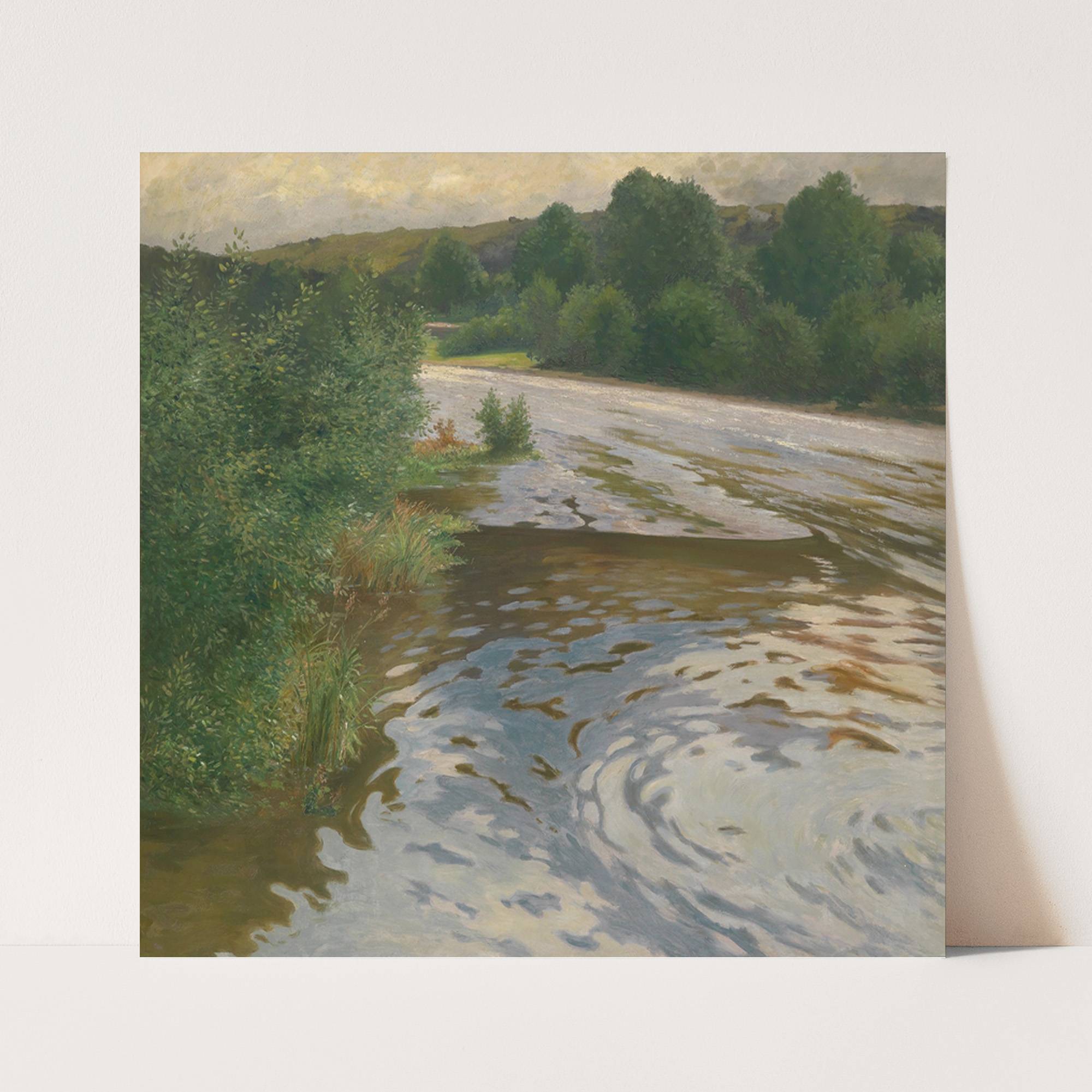 This serene landscape painting titled "Flusslandschaft" by Adolf Kaufmann beautifully captures the tranquility of a river scene during what appears to be early morning or late afternoon, suggested by the soft, warm light in the sky. The gentle ripples and...