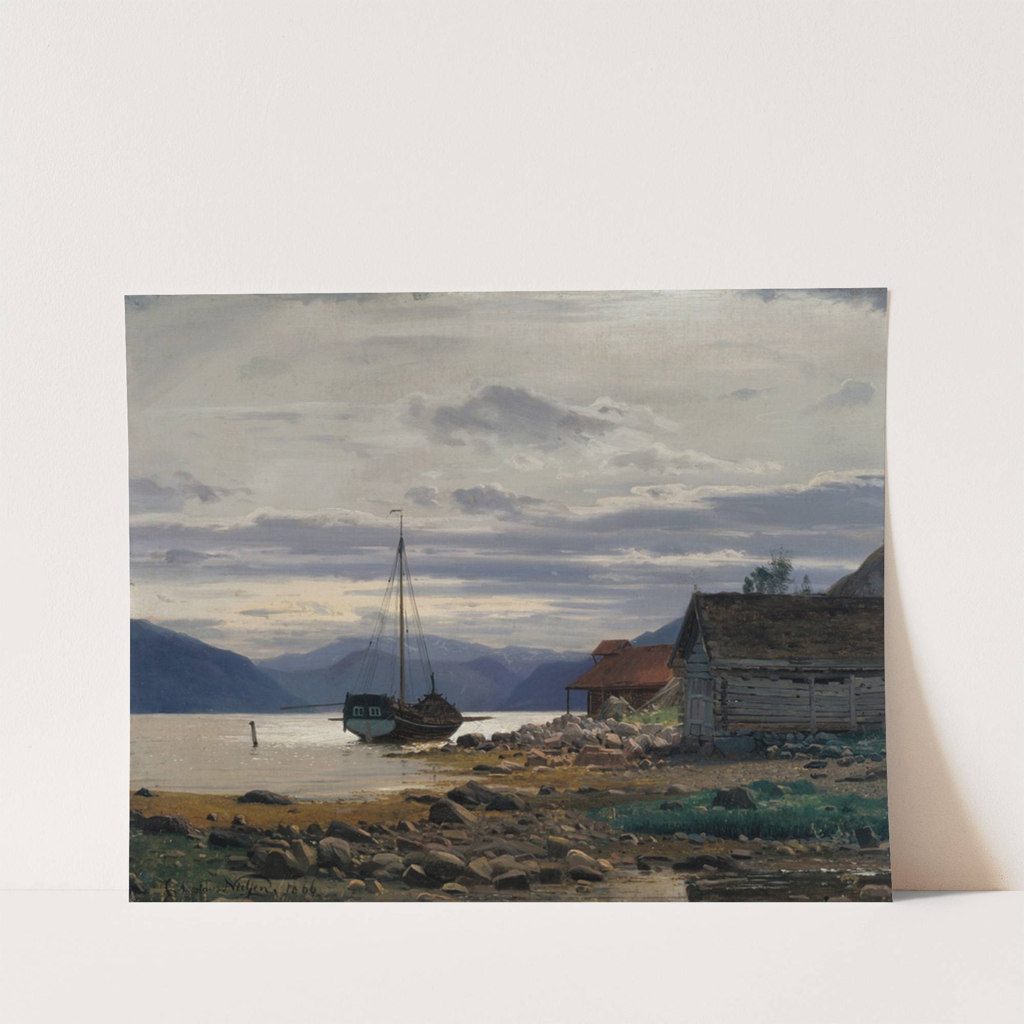 This enchanting landscape print captures the serene beauty of a tranquil waterfront scene, painted in a realistic yet slightly impressionistic style by Amaldaus Nielsen as "Fra Balestrand." The foreground features a rocky shoreline with scattered boulders leading to a calm...