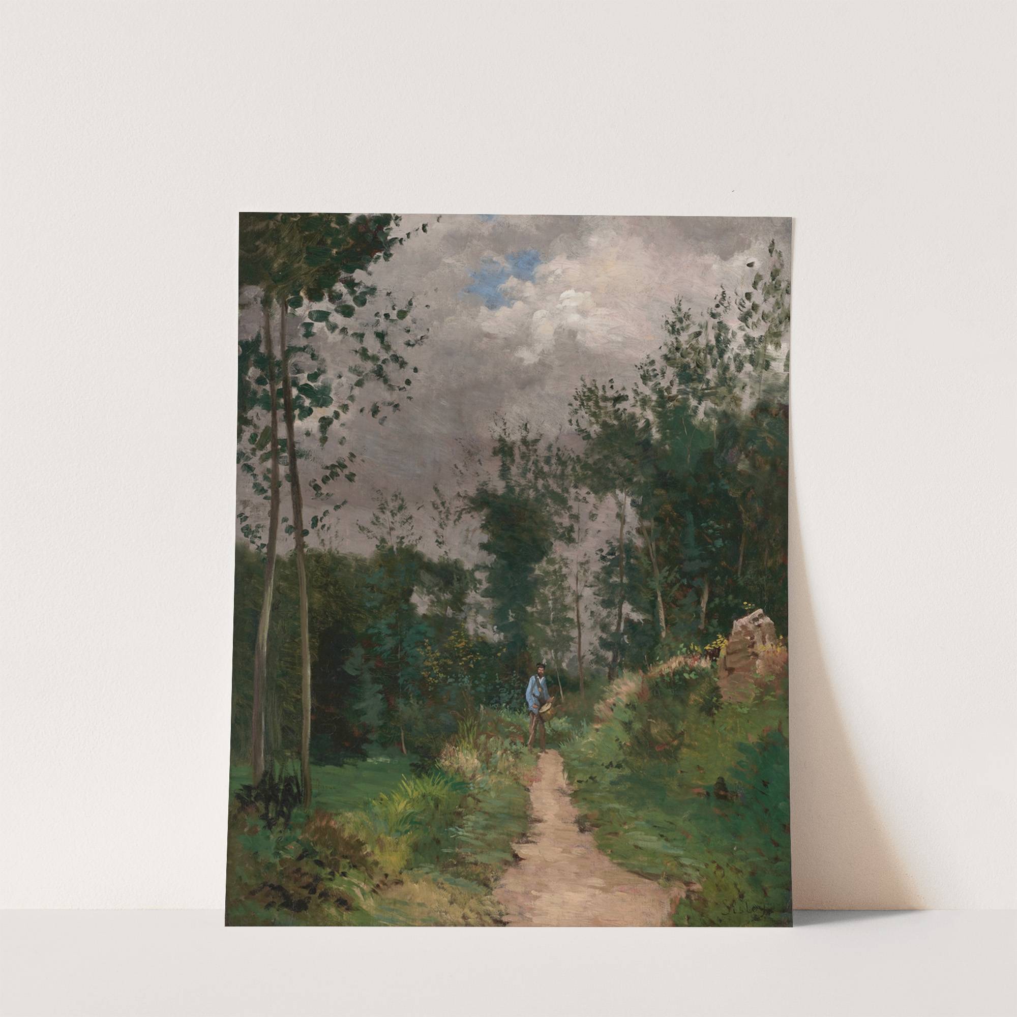 Immerse yourself in the serene beauty of nature with "Garde-champêtre dans la forêt de Fontainebleau," an exquisite painting by Alfred Sisley. This captivating artwork features a lush forest pathway that gently curves through dense greenery, leading your eye towards the...