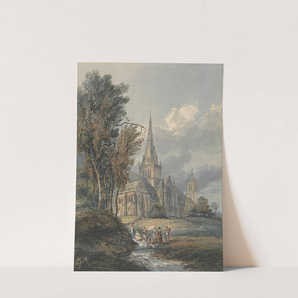 This beautifully rendered art print features "Glasgow Cathedral" by the renowned artist Thomas Girtin. The painting showcases a serene riverside scene with Gothic architecture dominating the background. A tall spire aTall, leafy trees on the left frame the cathedral, their...
