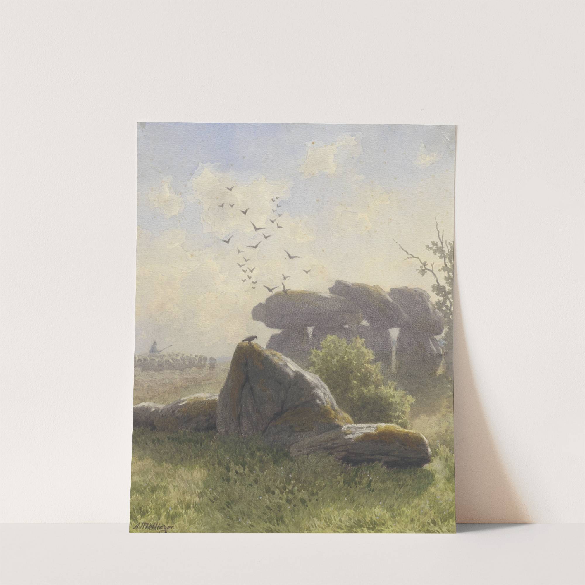Experience the serene beauty of nature in "Hunebed" by Alexander Mollinger, a breathtaking digital painting that brings tranquility to any space. This artwork captures a tranquil meadow scene bathed in soft, golden sunlight. The foreground features an imposing rock formation...