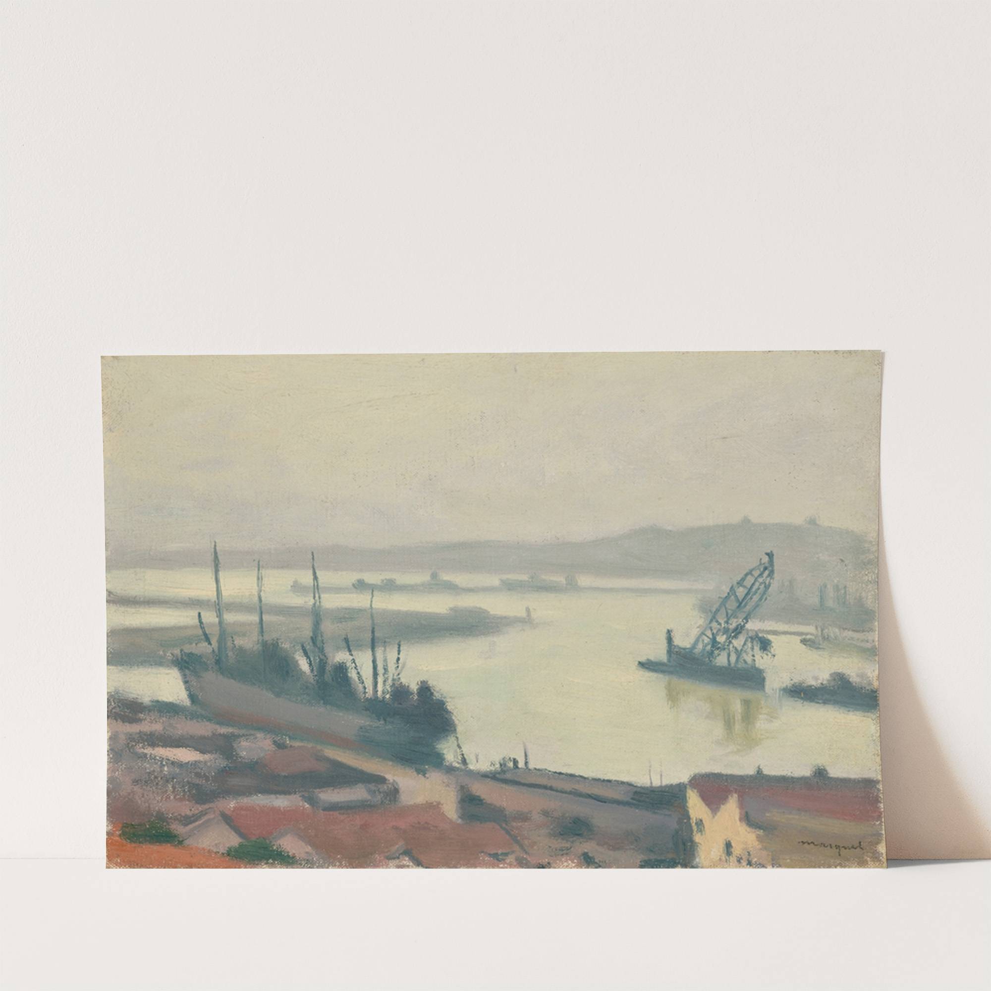 This painting, titled "Le Cargo" by Albert Marquet, is a beautiful depiction of a harbor scene rendered in soft, pastel hues. The artist uses a subtle color palette dominated by blues, greens, and earth tones to create a serene maritime...