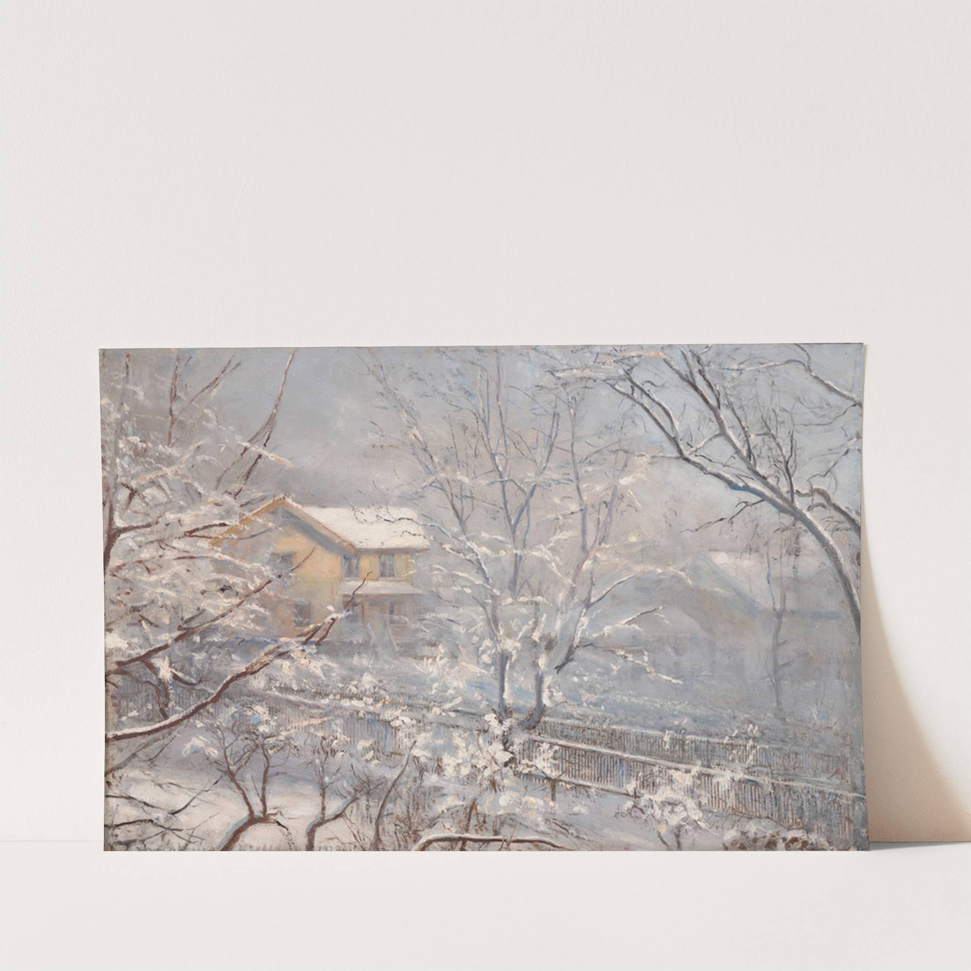 This serene winter landscape print captures the tranquil beauty of a snow-covered suburban scene. Created by renowned artist Amundsen, "Morgenstemming ved Majorstuveien 8" depicts a charming yellow house partially obscured by leafless trees laden with fresh snow. The delicate branches,...