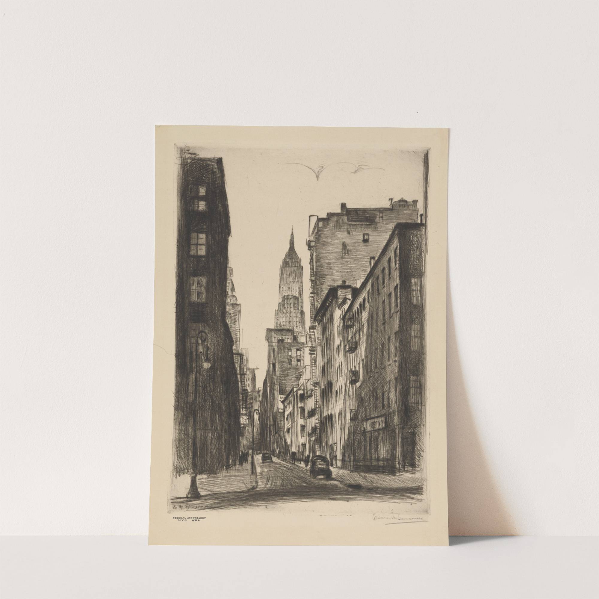 This monochromatic print captures the essence of urban life in New York City through a classic black-and-white drawing. "NYC Street Scene" by Elias Grossman features a cityscape with tall, imposing buildings lining either side of a narrow street that stretches...