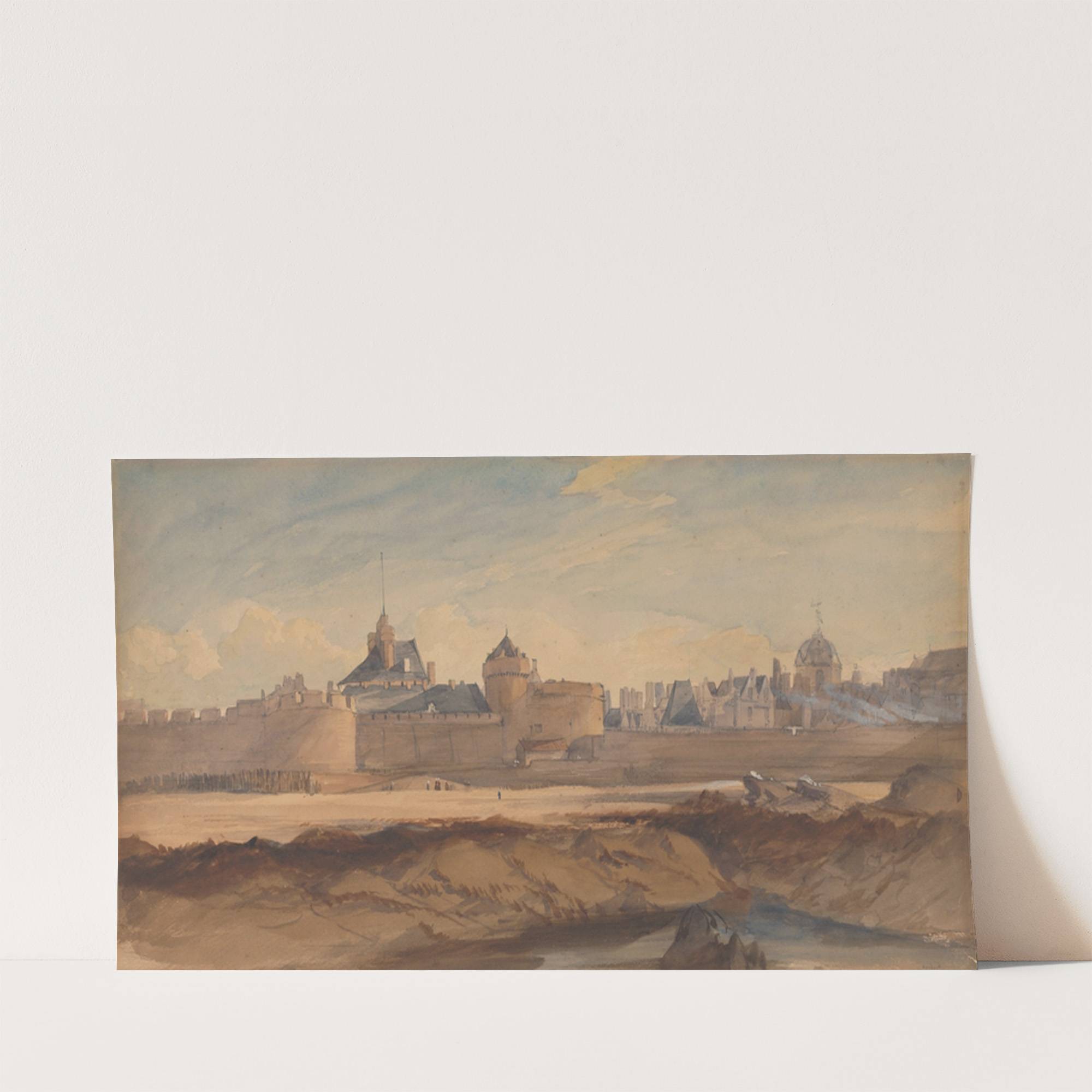 This beautifully rendered watercolor painting depicts the historic cityscape of St. Malo, France, created by artist Alfred Herbert. The composition showcases the medieval architecture with intricate detail, featuring several fortified towers and rooftops in muted tones of beige and brown,...