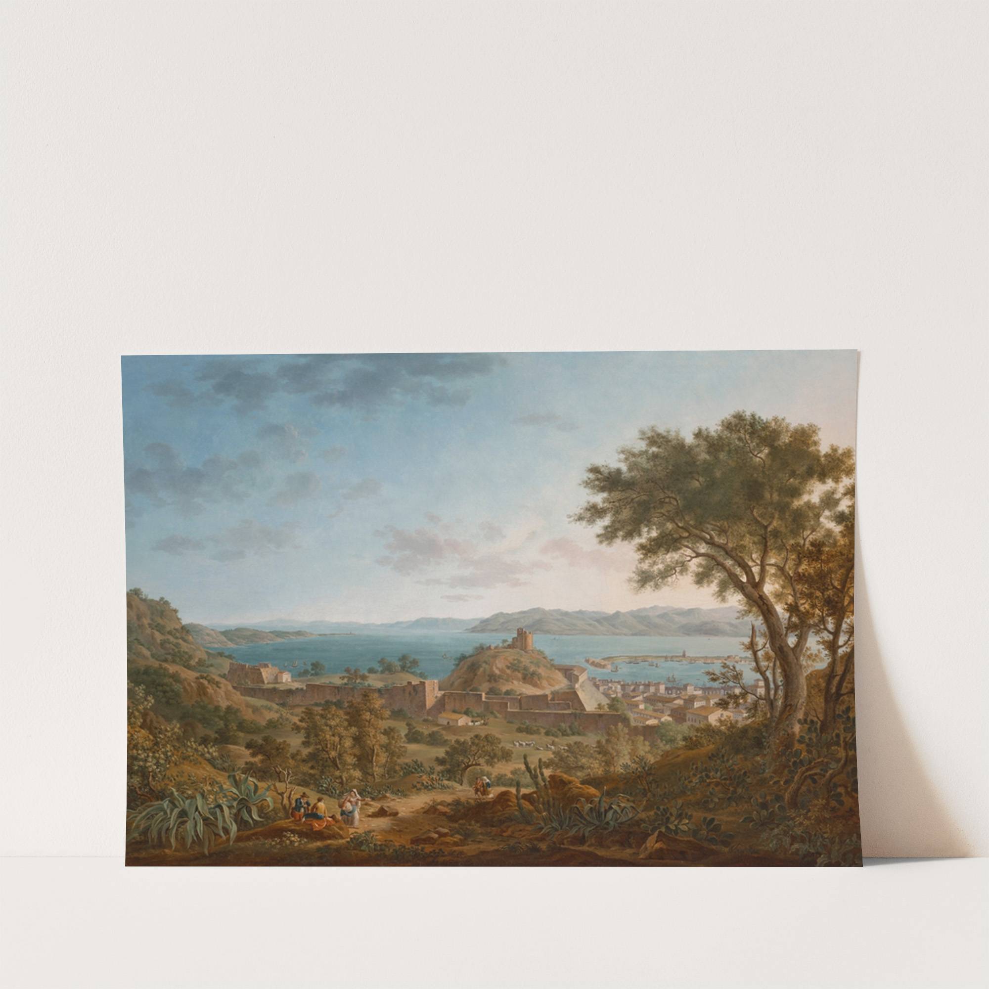 This art print features "The Strait of Messina, Sicily from the West" by Alexandre-Hyacinthe Dunoy. It showcases a breathtaking landscape view of an ancient Mediterranean town nestled between rolling hills and the sparkling sea in the background. The scene is...