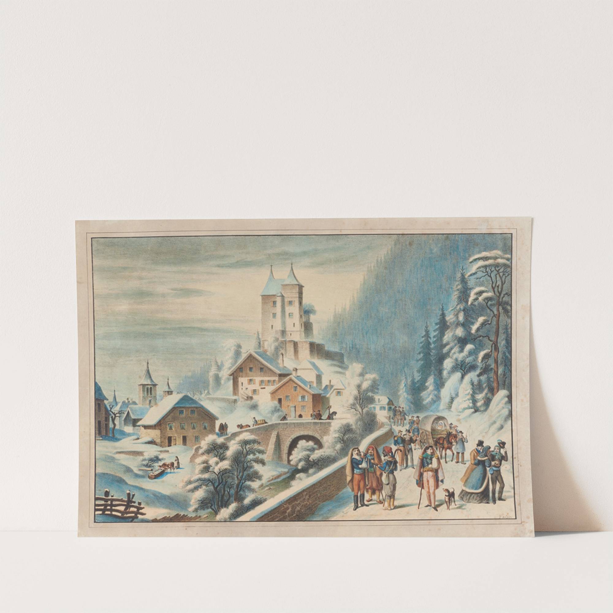 This captivating art print features "Valangin (1915-1945)" by Adolphe Doudiet, showcasing a serene winter village scene with exquisite detail. Dominating the composition is a grand castle with two tall, snow-capped towers positioned atop a gentle hill in the background. The...
