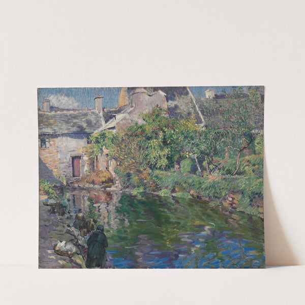 This vibrant impressionist painting depicts a charming rural scene titled "Washerwomen at Goyen" by artist Abel George Warshawsky. The artwork captures the serene beauty of a countryside house surrounded by lush greenery and a gently flowing stream in the foreground.The...
