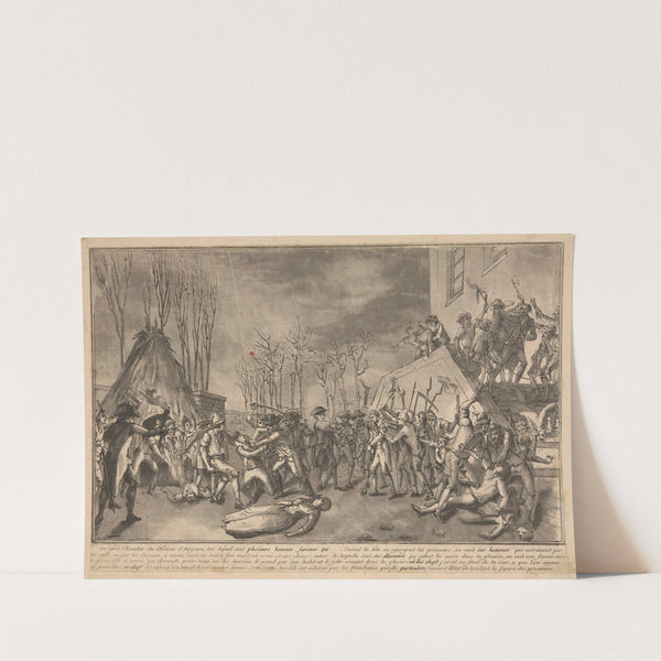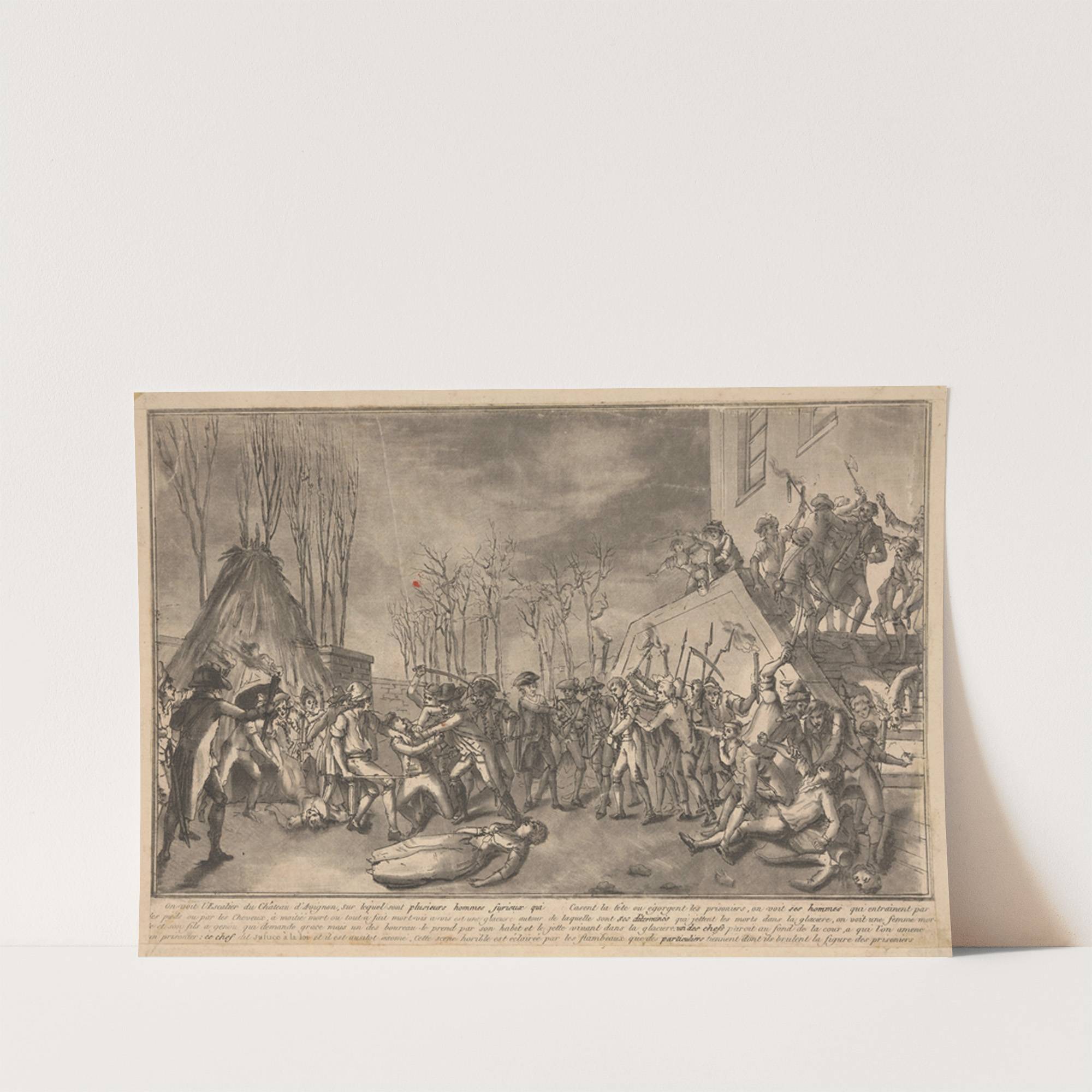 This monochromatic etching, titled "The Staircase of Avignon" by an anonymous artist, captures a vivid historical scene with meticulous detail. The composition is dominated by a group of soldiers and civilians engaged in various intense interactions. In the foreground, two...