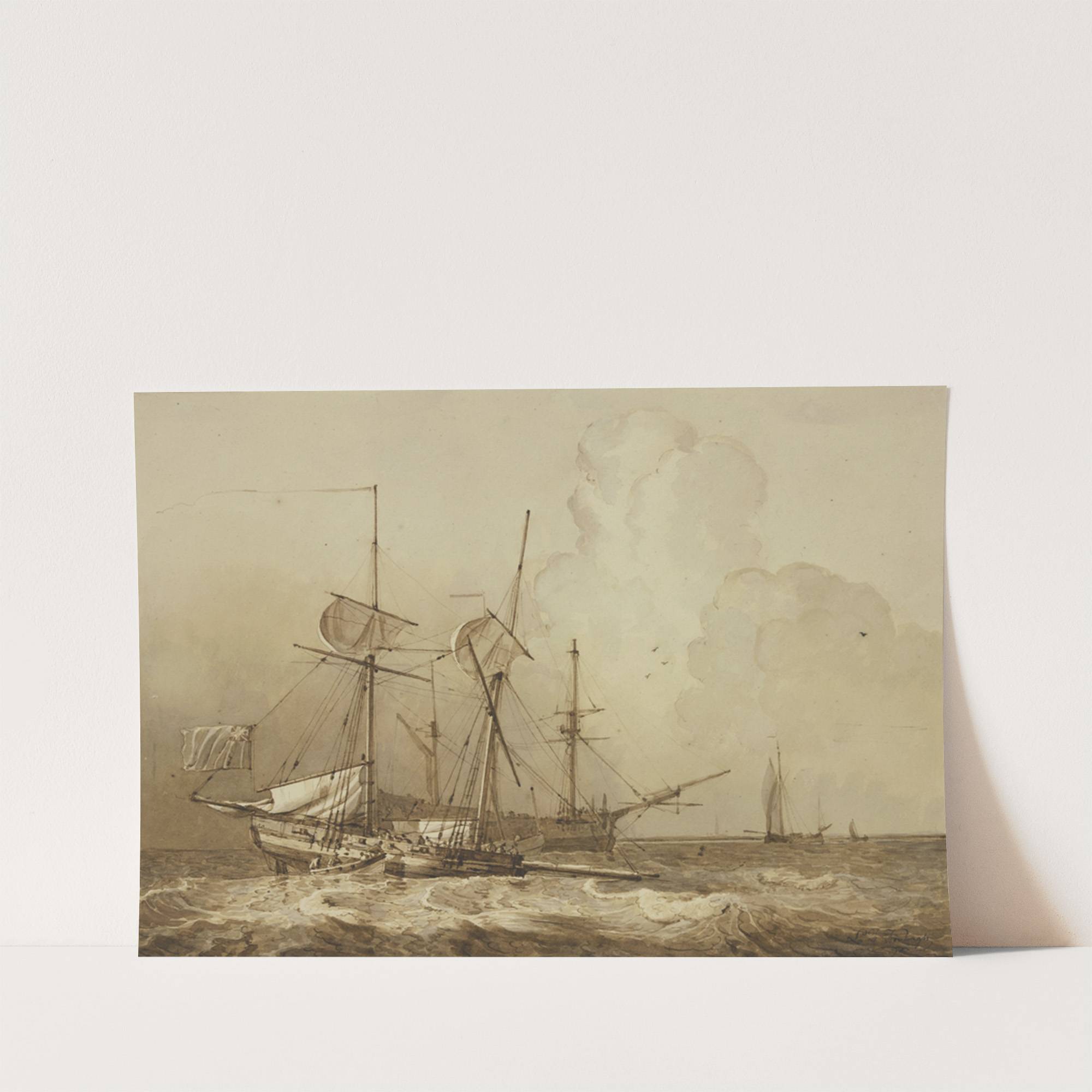 Bewegte See, ein zweimastiges Schiff segelt nach rechts an einem Dreimaster vorbei, der die Segel eingerefft hat by Leendert de Koningh - Wall Art Print