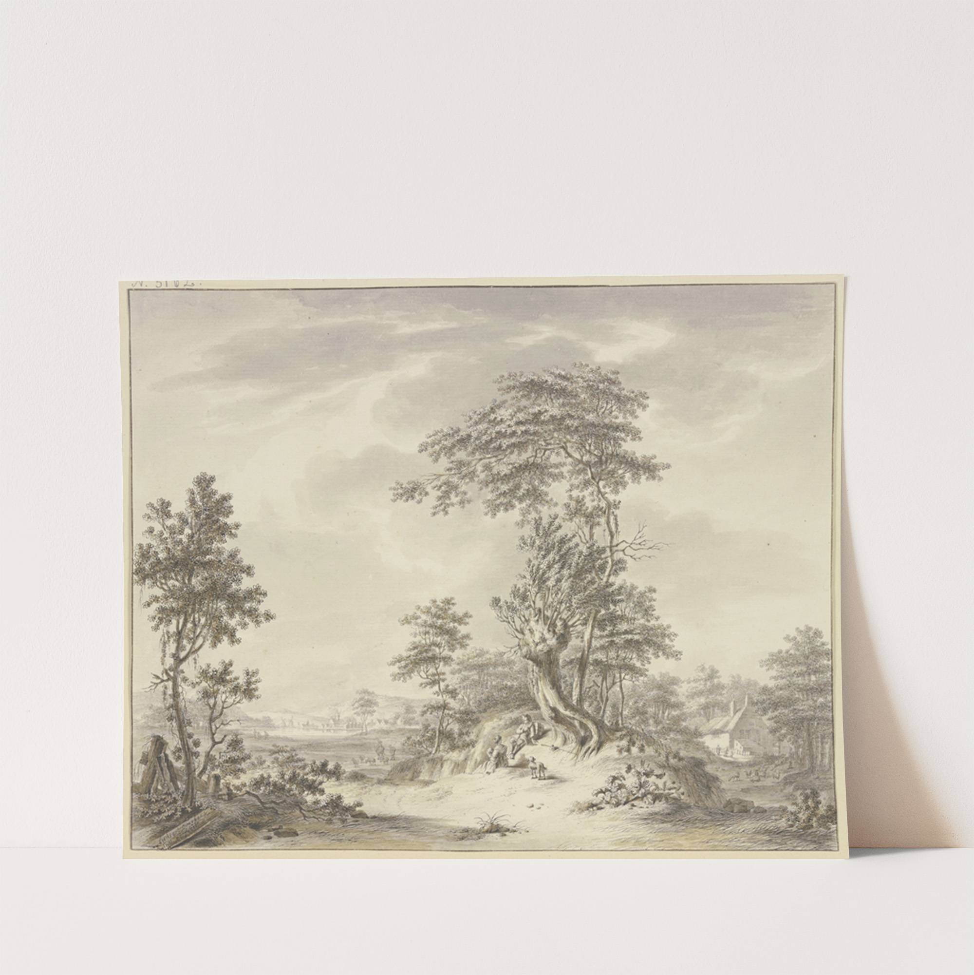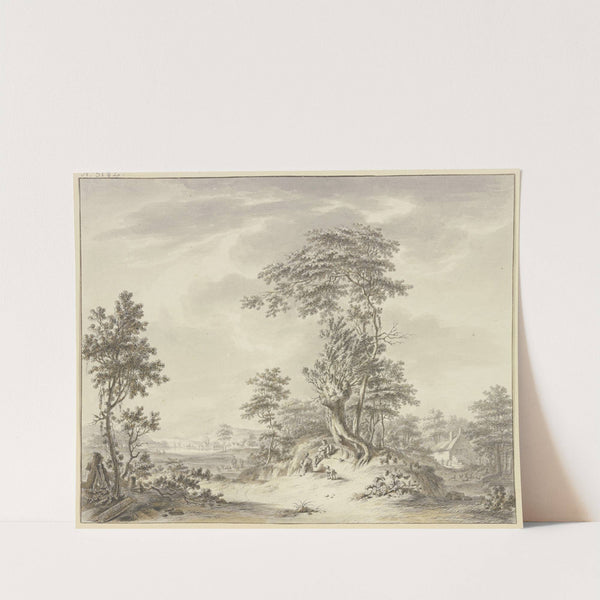 Rechts im Vordergrund unter einem Weidenstamm ein Mann und eine Frau mit Kind und Hund by Leendert Overbeek - Wall Art Print