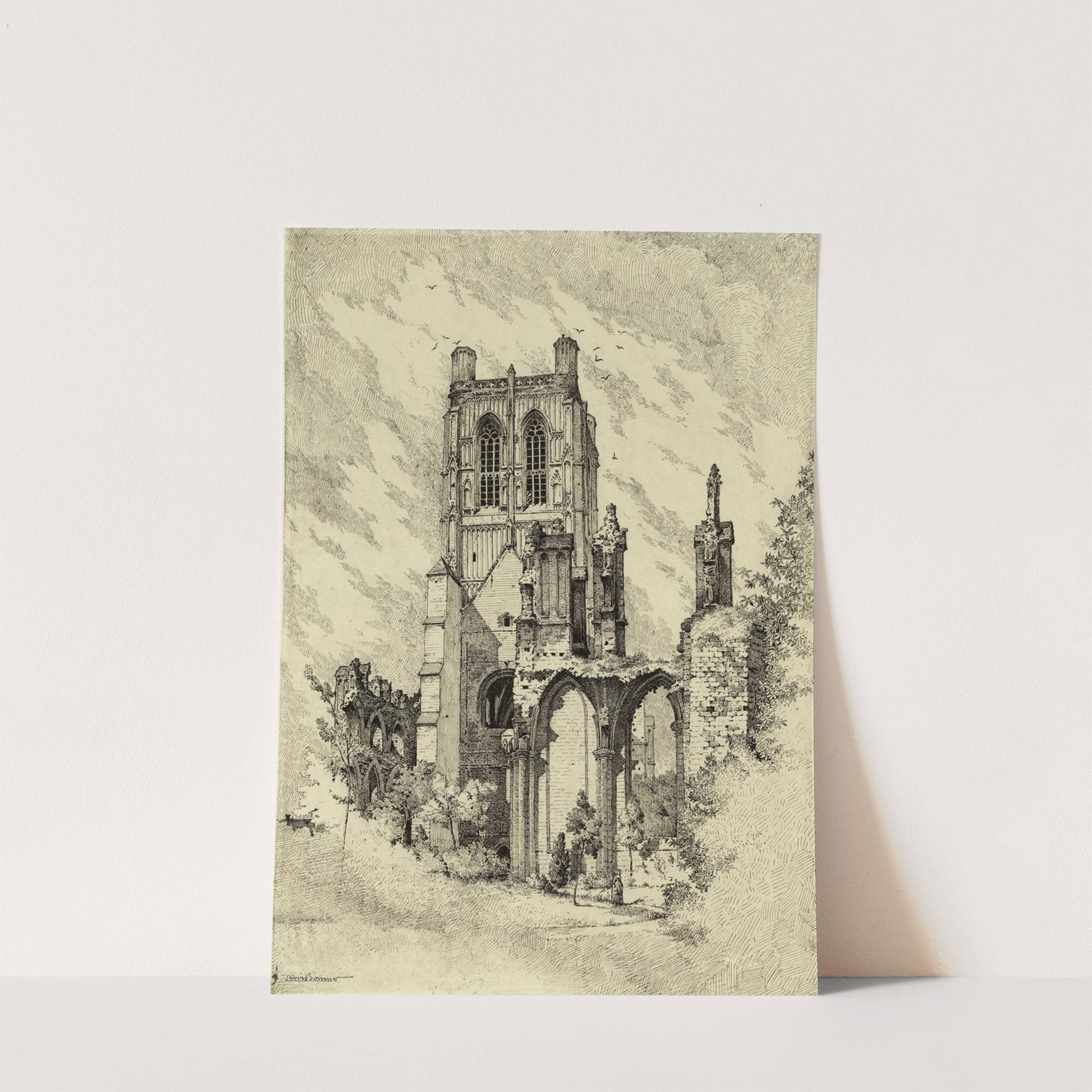 This black-and-white etching depicts the ruins of a Gothic-style church. The tall, rectangular tower dominates the center with its detailed architectural elements: arched windows, intricate brickwork, and small battlements at the top. To the right, a smaller section of the...
